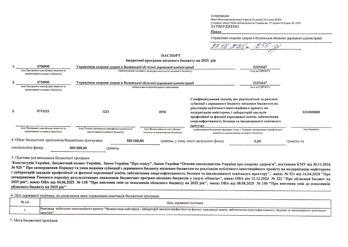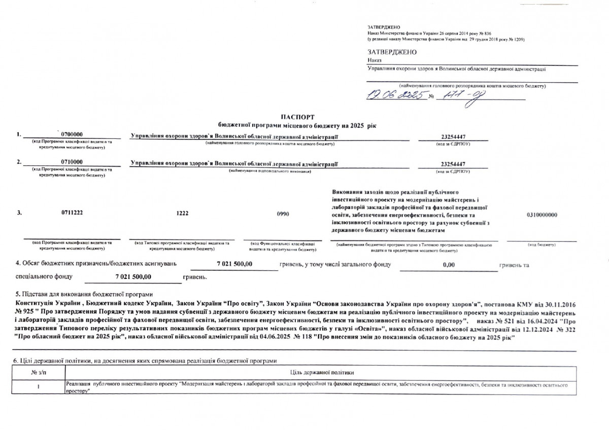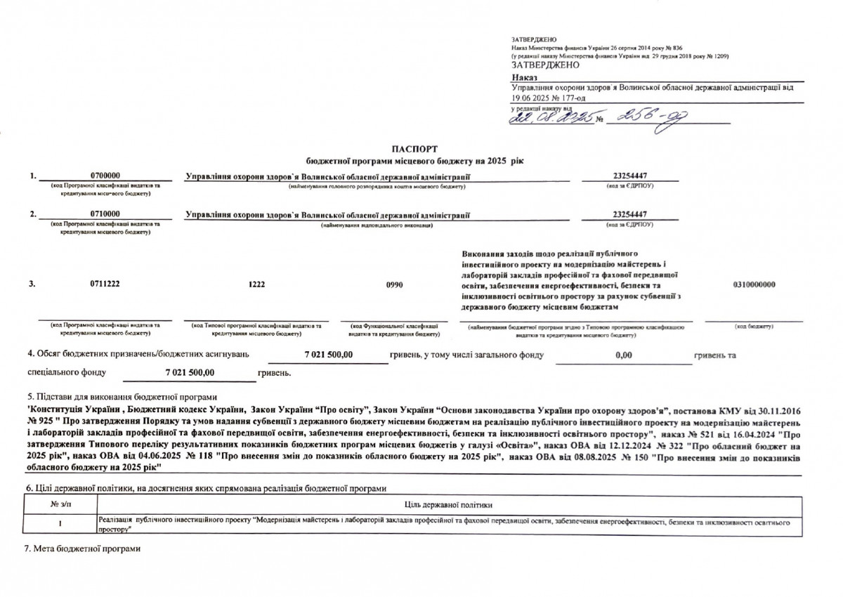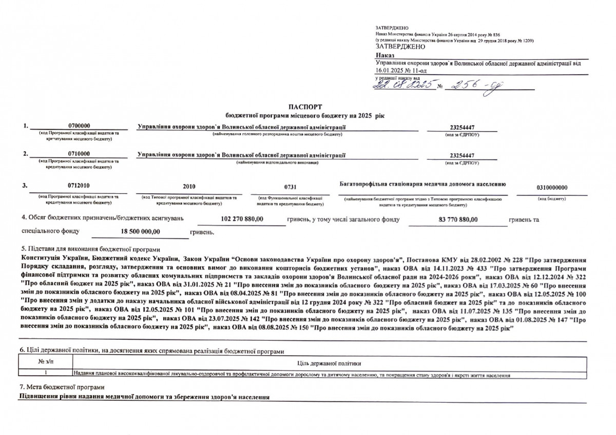 Паспорт бюджетної програми 7731010 «Здійснення виконавчої влади у Волинській області» на 2022 рік