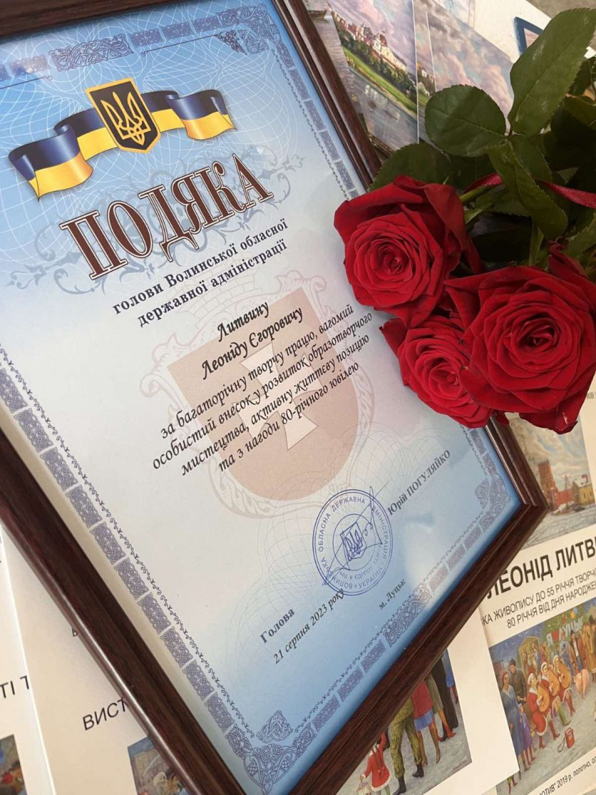 Сьогодні, 22 серпня 2023 року відзначає 80 років від дня народження Леонід Єгорович Литвин – заслужений художник України. Народився Леонід Литвин 22 серпня 1943 року в селі Ощів Горохівського району на Волині. Дитинство і юність пройшли в Луцьку. Два роки навчався в художній студії Петра Сензюка, що діяла при Луцькому будинку піонерів. Його наставниками у Львівському училищі прикладного та декоративного мистецтва імені Івана Труша були Валерій Єлізаров, Михайло Ткаченко, Володимир Овсійчук. По закінченні навчання в училищі у 1968 році (відділ монументального живопису) працював за направленням у Волинських художньо-виробничих майстернях Художнього фонду УРСР. Виконував творчі замовлення. Активно включився в художнє життя міста. Уже в 1968 році вперше взяв участь у Республіканській виставці акварелей у Києві. Леонід Литвин працює в галузі станкового і монументального живопису, член Національної спілки художників України (1990), заслужений художник України (2008). Він – автор мозаїк та розписів громадських споруд міст і сіл Волині (переважно це автопавільйони з анімалістичними мотивами декору), станкових творів. Працює в жанрах пейзажу, натюрморта, портрета, тематичної картини. Один з улюблених жанрів митця пейзаж. Ним написано чимало краєвидів Луцька, його околиць, пам’яток історії і культури Волині. На його полотнах оживає краса рідного краю як образ матері-землі: ліси і луки Полісся, озеро Світязь, широкі поля Горохівщини. Творчу уяву Литвина захоплює далека й сувора Північ, де художник служив моряком на Балтійському й Північному флотах. Цим творам притаманна монументальність у вирішенні теми, стримана кольорова гама. Леонід Литвин багато мандрує, бере участь у пленерах. Майстерно виконані його седнівські пейзажі, мальовничі плеса ковельщини. Дихають величаво Карпатські гори, бринить лірично Чернігівщина, замріяна річка Снов з похиленими старезними вербами на березі і красенями конями.