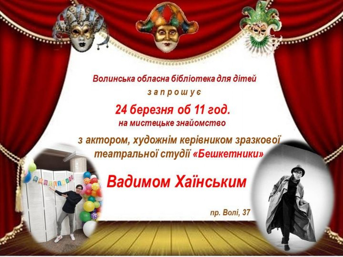 24 березня 2021 року Волинська обласна бібліотека для дітей запрошує на творчу зустріч з художнім керівником зразкової дитячої театральної студії «БЕШКЕТники» Вадимом Хаїнським та юними акторами.