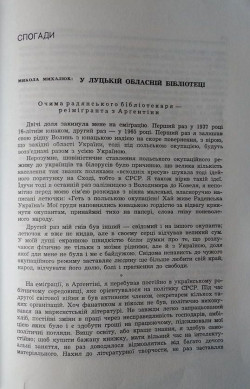 Для працівників бібліотеки та користувачів Волинської ДОУНБ імені Олени Пчілки справжнім відкриттям стало ознайомлення з публікаціями Миколи Михайлюка, який у кінці 50-х років працював бібліотекарем у книгозбірнях Торчина та Луцька. Надзвичайно цікаві факти подані в його статтях: „У Луцькій обласній бібліотеці (число 4 за 1967) та „Наш виїзд в Україну” (число 10 за 1986). Упевнені, що цей доробок краянина, що повернувся з Радянського Союзу в Аргентину, буде досліджено найближчим часом науковцями, краєзнавцями, музейниками, оскільки проливає світло на розвиток культурної галузі Волині кінця 50-х – початку 60-х років.