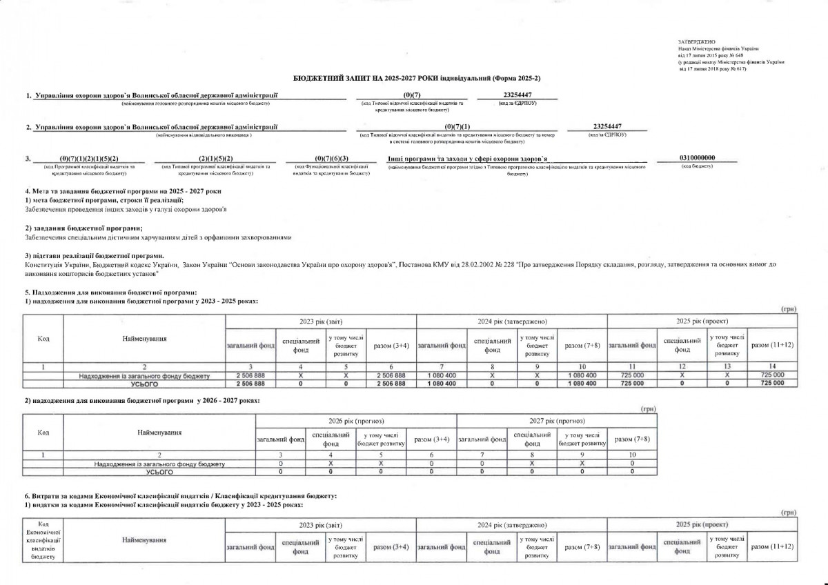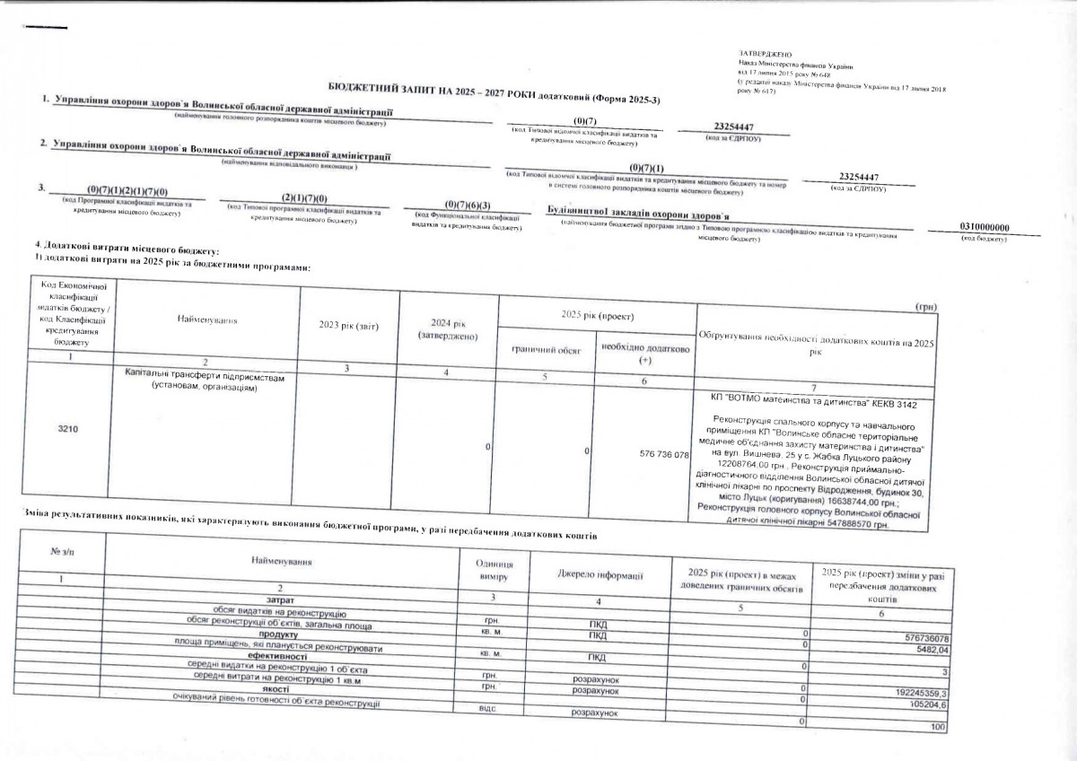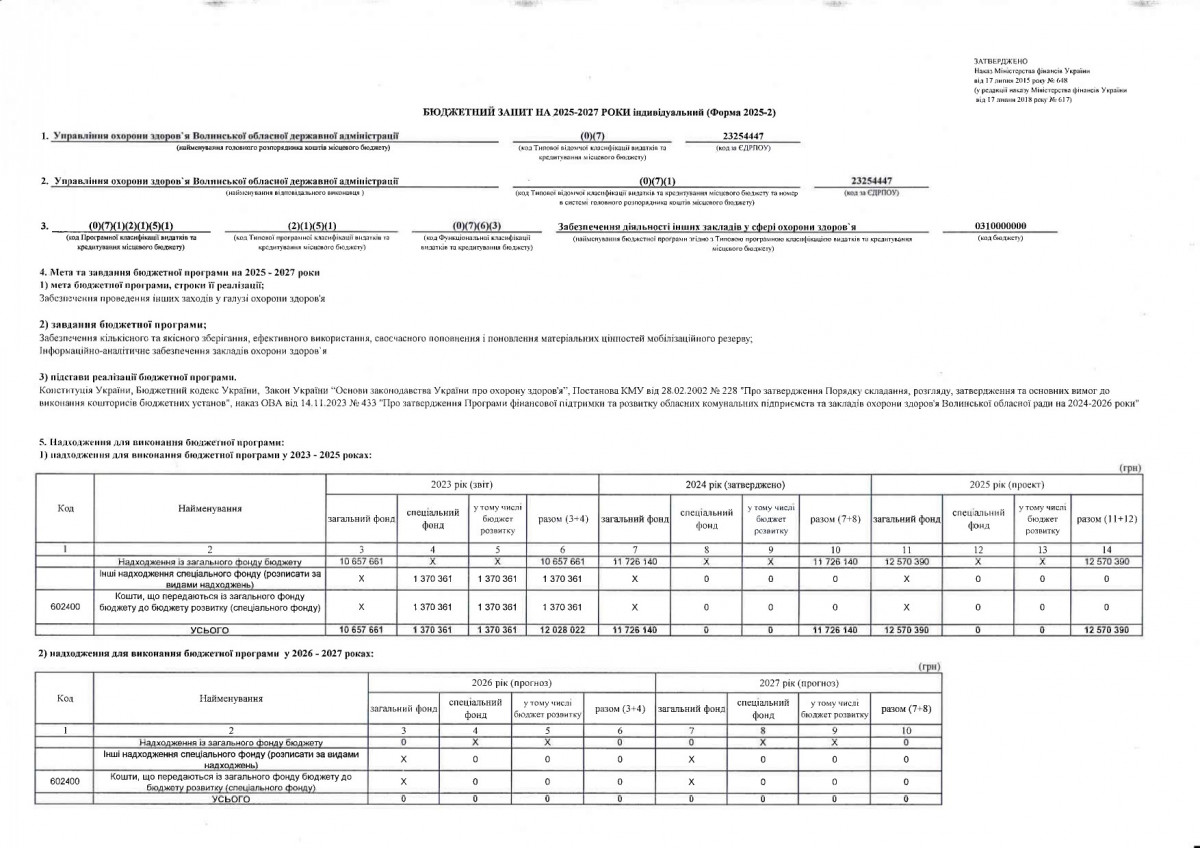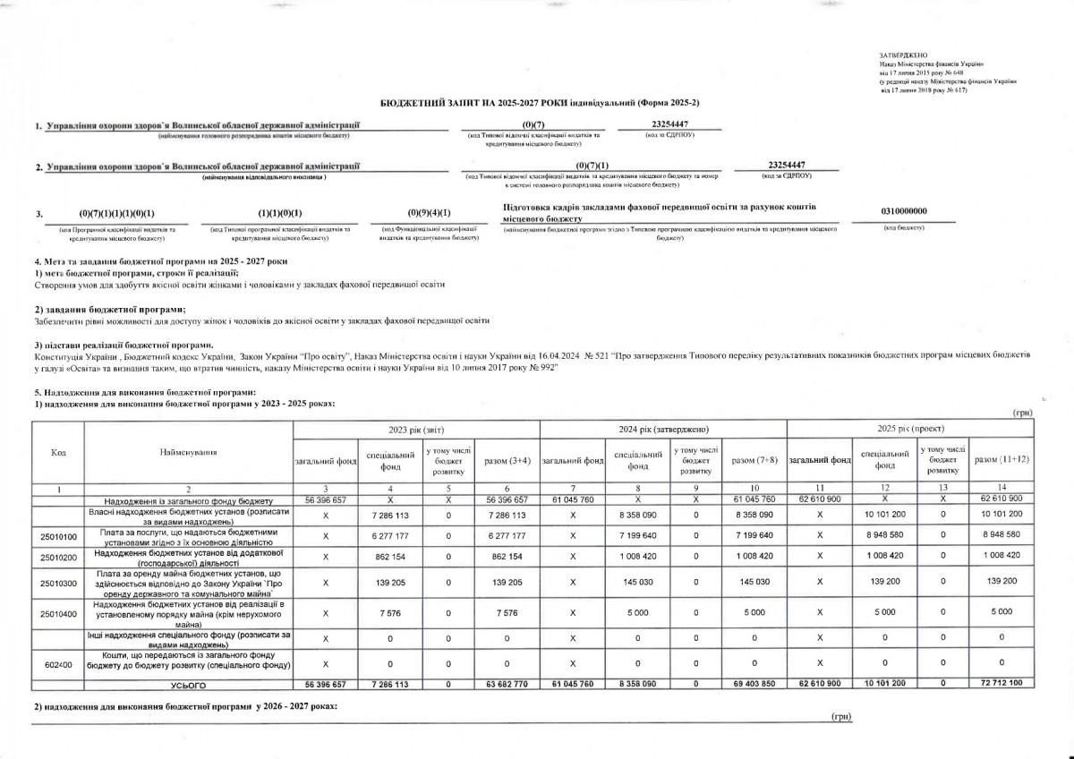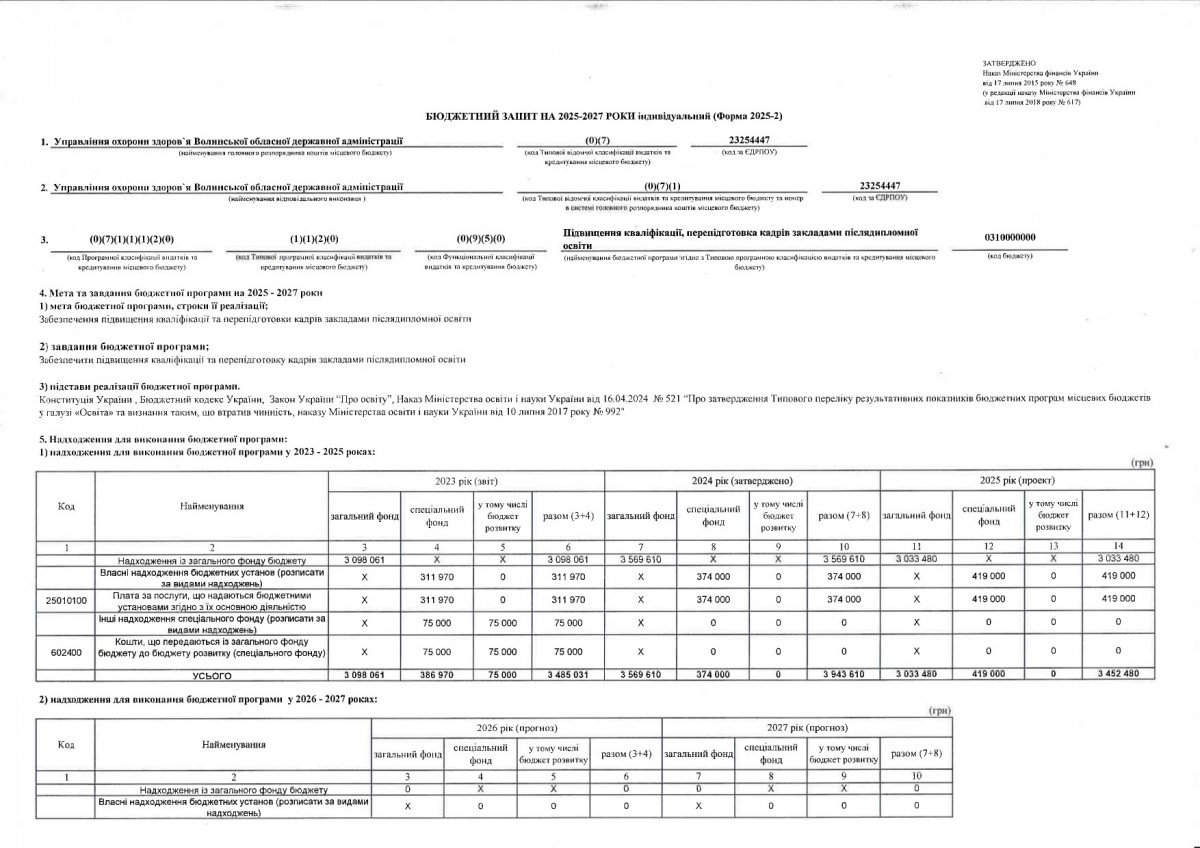 Бюджетний запит Волинської обласної державної адміністрації на 2025-2027 роки за бюджетною програмою 7731010 «Здійснення виконавчої влади у Волинській області»
