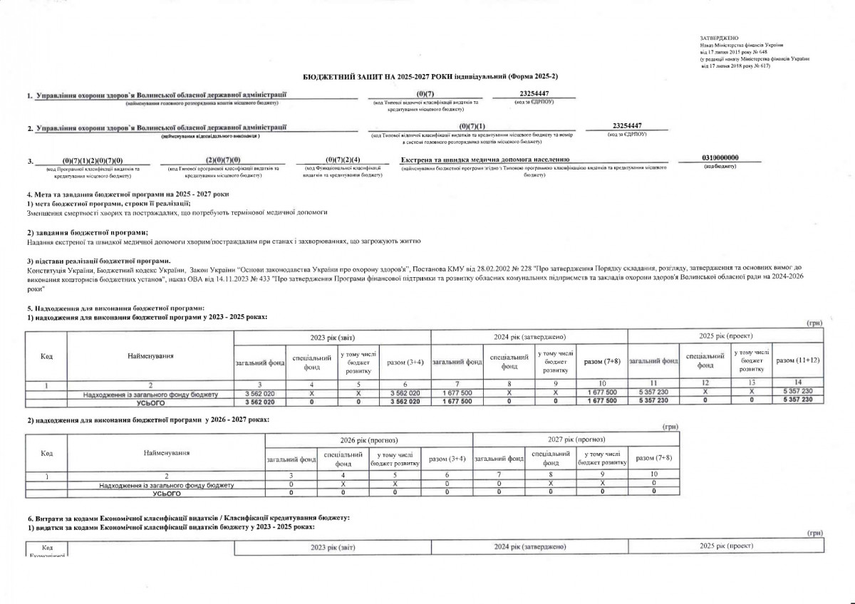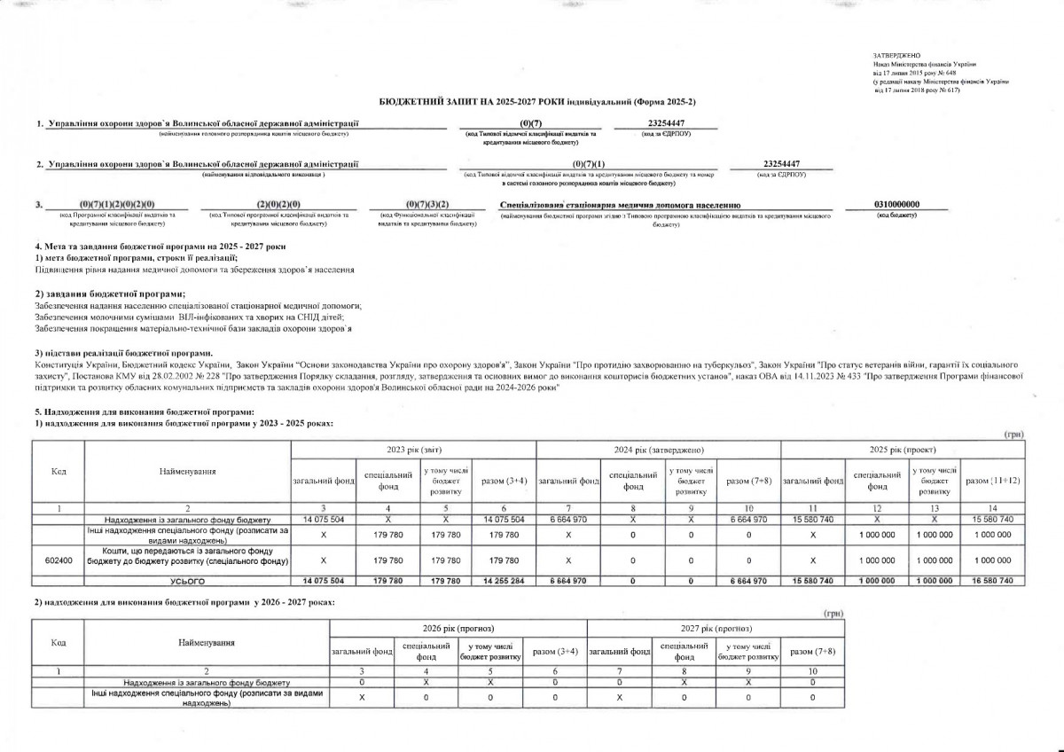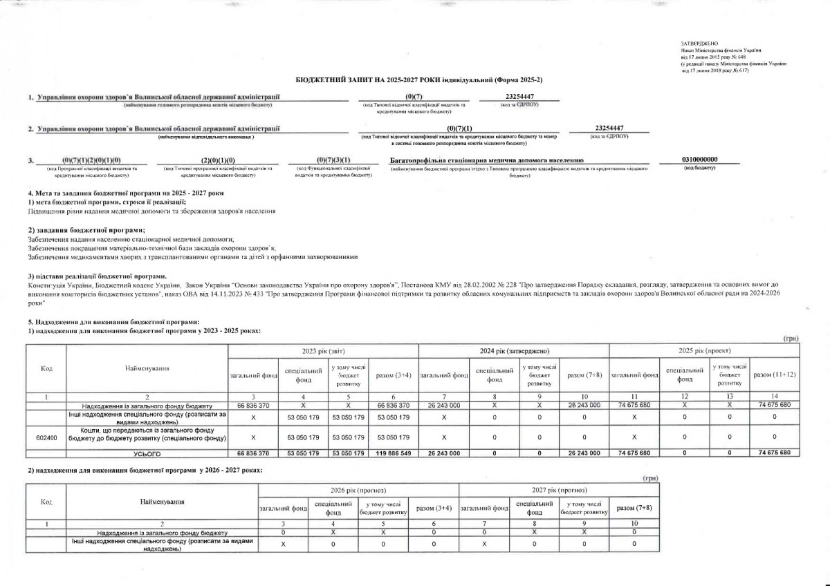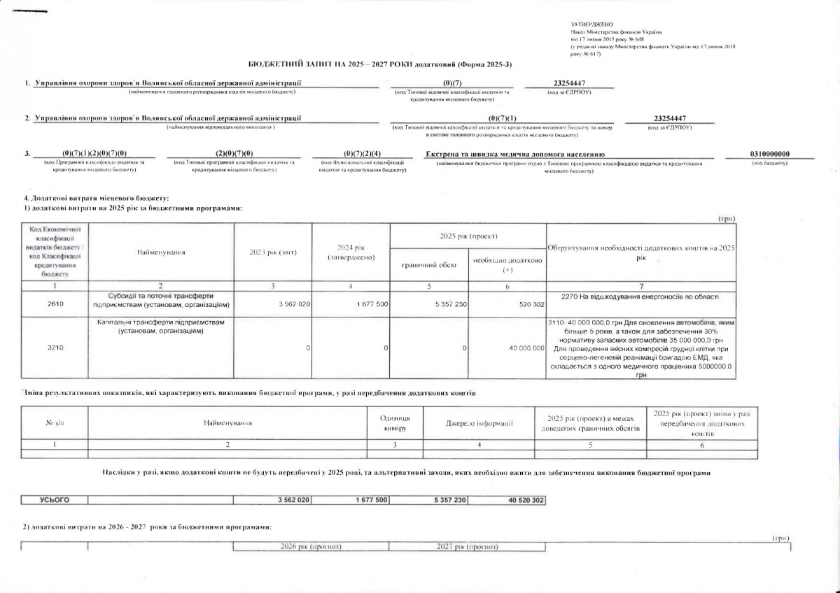 Бюджетний запит Волинської обласної державної адміністрації на 2025-2027 роки за бюджетною програмою 7731010 «Здійснення виконавчої влади у Волинській області»