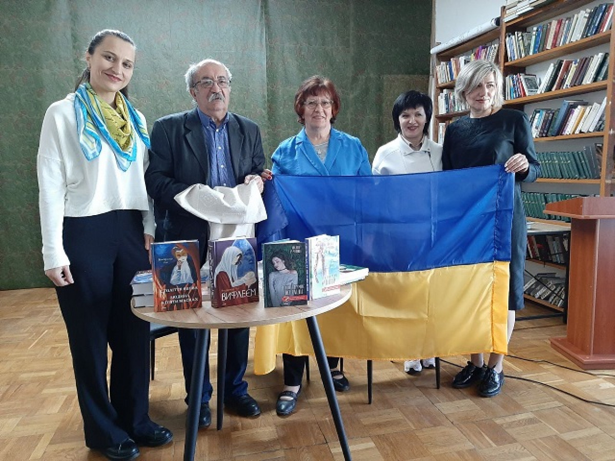 Наталія Кірпіченко, викладач української мови коледжу, та Ірина Данилюк, завідувач відділення, на згадку презентували письменникам подарунки від коледжу, зроблені дбайливими руками учнів професії «Кравець. Вишивальник» – український прапор та вишитий рушник.