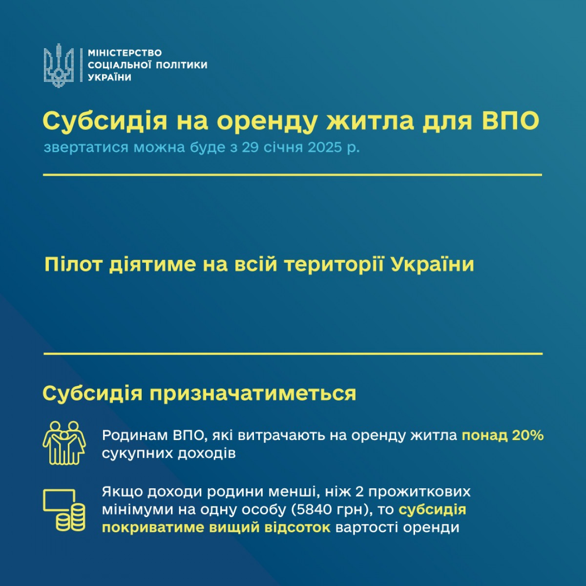 Відповідно до нормативно–правового акту, протягом двох років буде реалізовано експериментальний проєкт щодо надання субсидії внутрішньо переміщеним особам на оплату вартості або частини вартості найму (оренди) житлового приміщення на території України, крім тих, що включені до переліку територій, на яких ведуться (велися) бойові дії або тимчасово окупованих російською федерацією, та компенсації частини податку на доходи фізичних осіб або єдиного податку та військового збору.