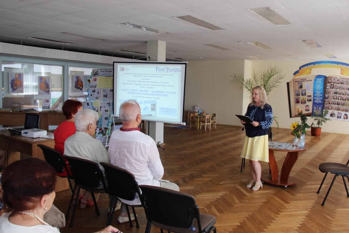 Під час зустрічі гості бібліотеки мали змогу ознайомитися з книжковою виставкою на тему: «Голос України» – сучасний літопис українського державотворення».
