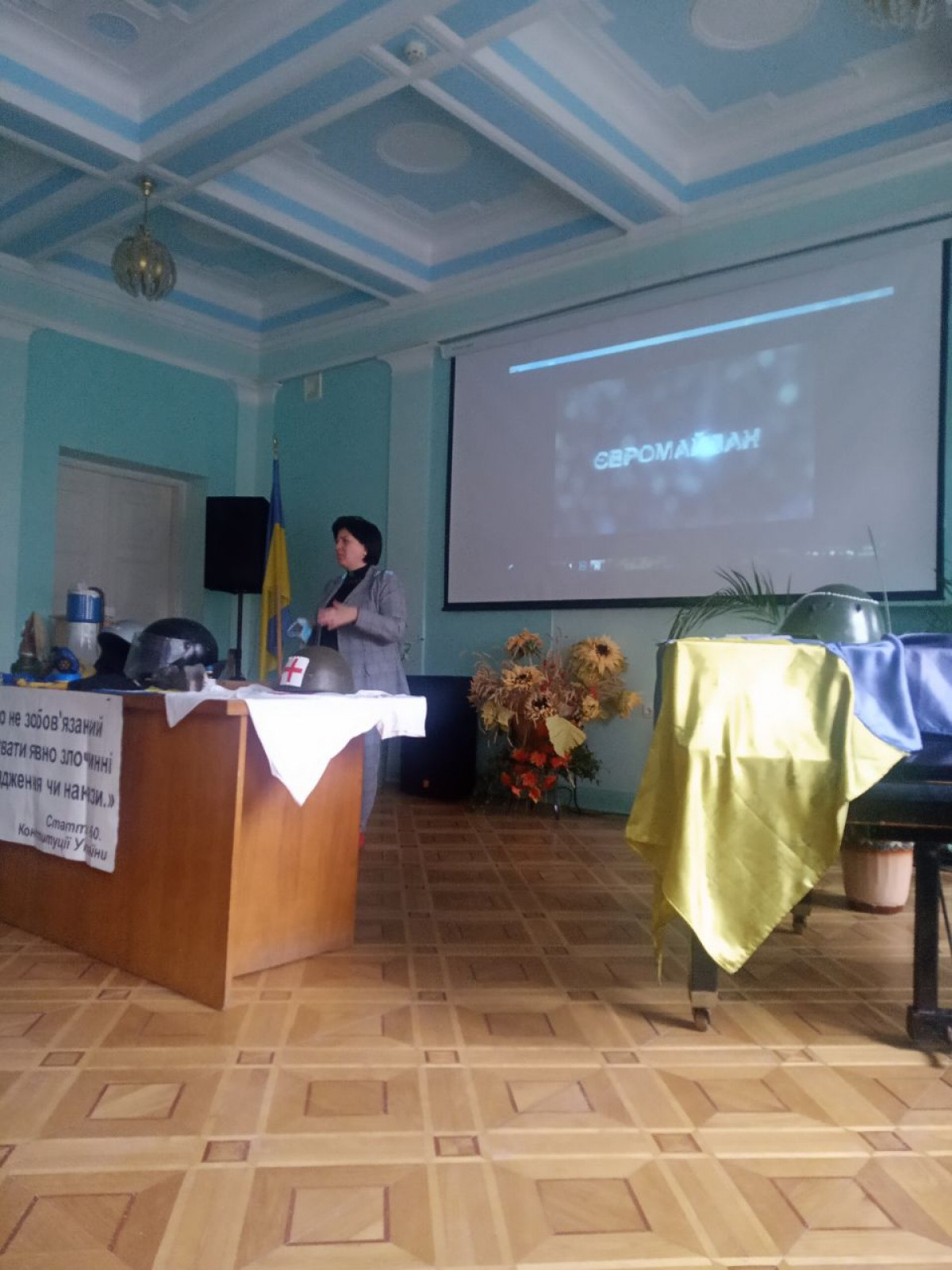 Наукова співробітниця науково-експозиційного відділу новітньої історії Марія Філонюк розповіла хроніку тих подій, звернувши увагу відвідувачів на експонати привезені з Майдану. За кожною річчю стояла людська доля, чиєсь життя, яке обірвалося. Музейниця згадала загиблих, а саме як наші земляки стали Героями Небесної сотні, як кожен з них загинув, аби ми сьогодні жили гідно на своїй рідній землі.
