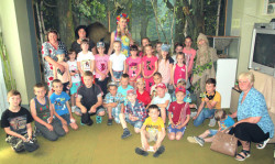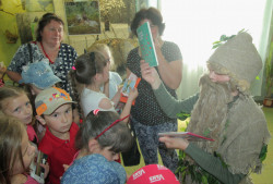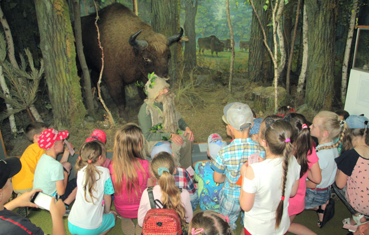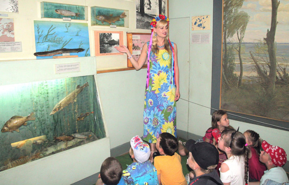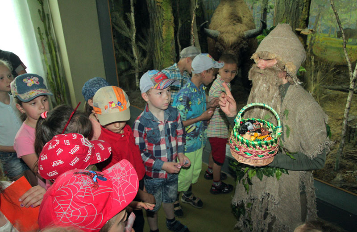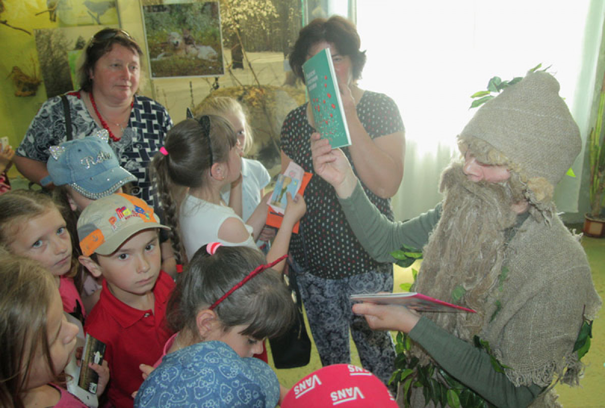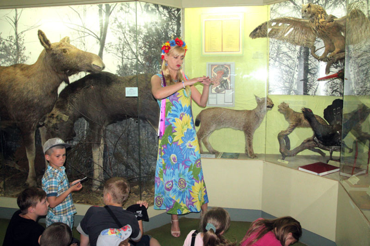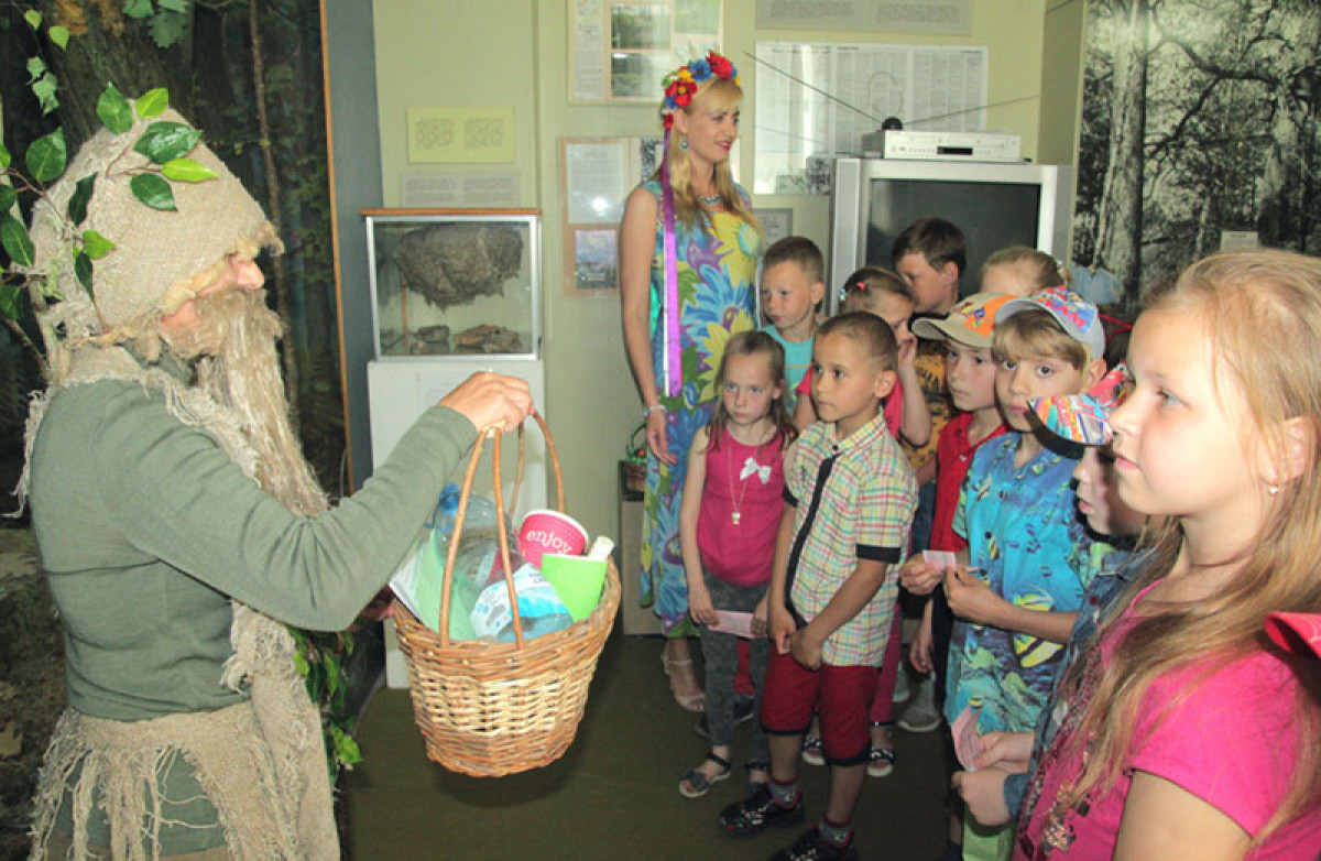 Учасники заходу, школярі із села Новино-Добрятин Млинівського району Рівненської області, з ведучою (науковим співробітником відділу науково-освітньої та методичної роботи Ларисою Пальохою), Дівчиною-Літо (старшим науковим співробітником відділу природи Людмилою Ланшиною), та Лісовичком (заввідділом природи Тетяною Тищенко) пройшли екологічною стежкою по експозиційних залах музею.