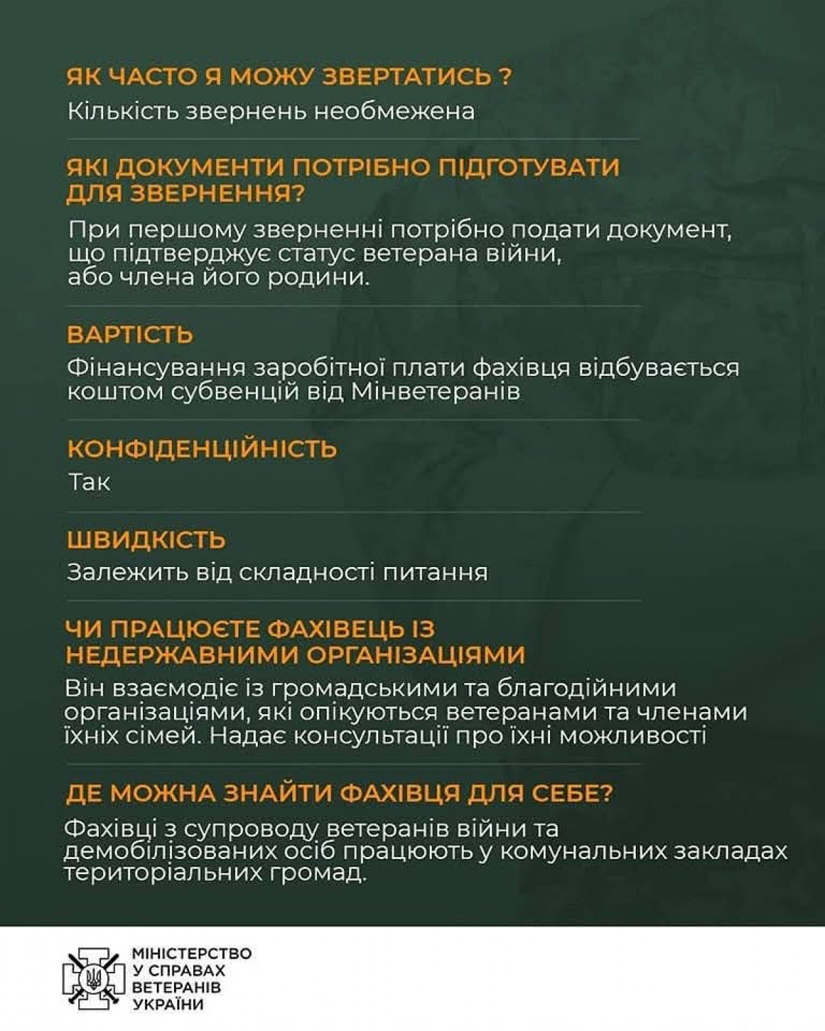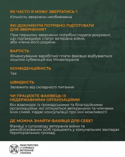 Фахівець є інформаційним радником для ветеранів, членів їхніх родин, сімей Захисників та Захисниць України, родин загиблих, зниклих безвісти та військовополонених, постраждалих учасників Революції Гідності та їхніх родин.