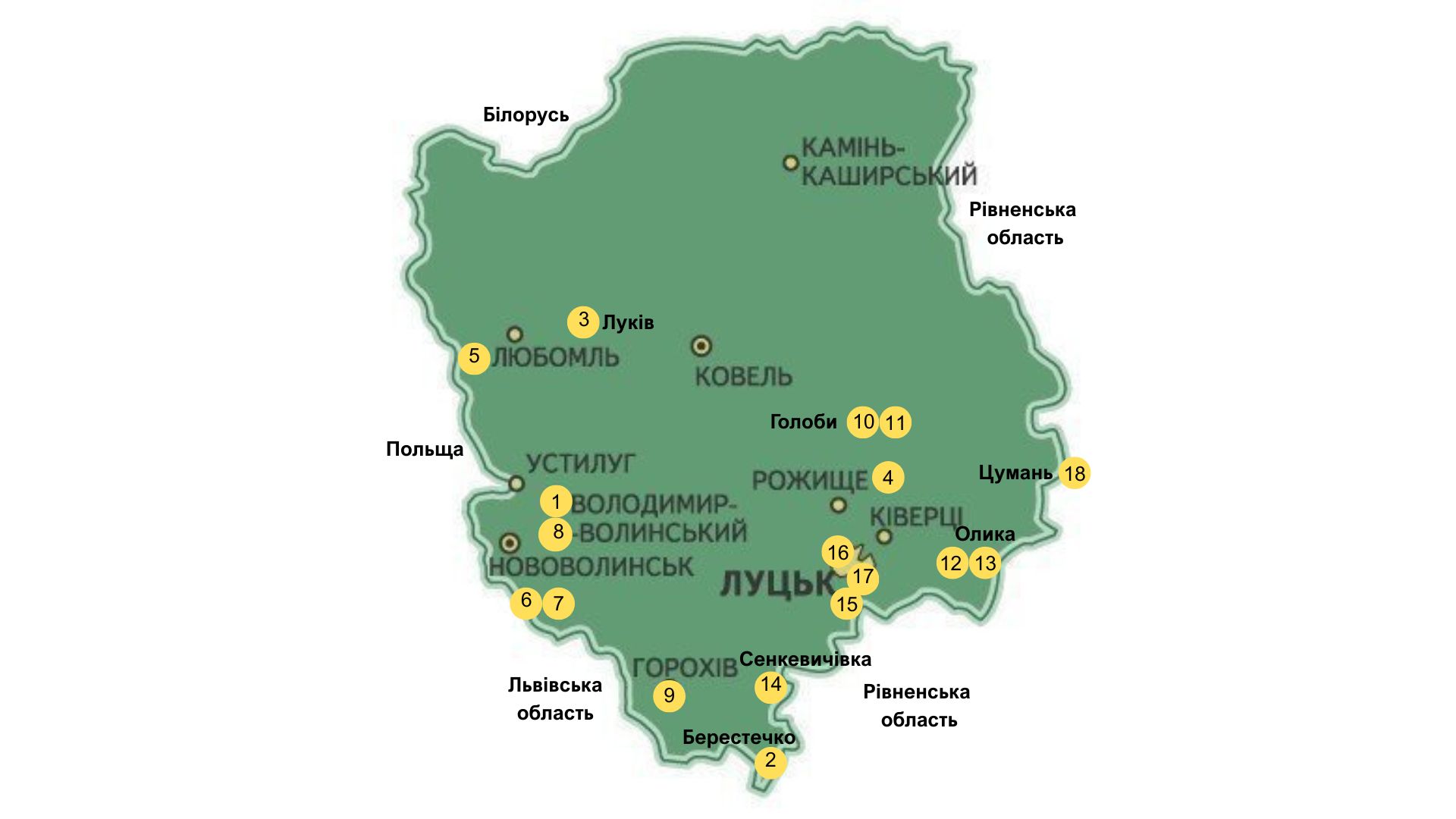 Також пропонуємо вам ознайомитись із схематичним зображенням наявних місць тимчасого проживання на карті Волині:
