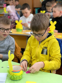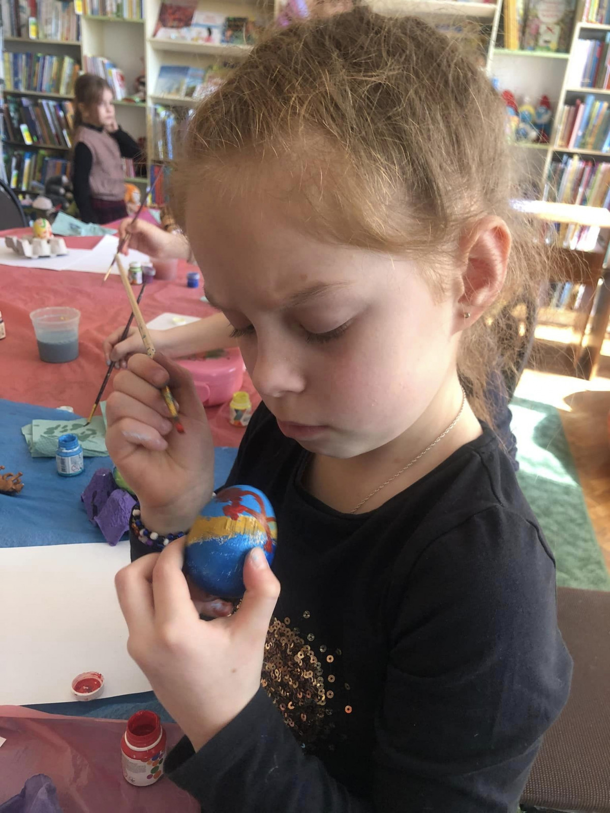 Ще однин захід в бібліо-арт-просторі – «Великоднє диво» проведено художницею, керівницею арт-локації «Творчий калейдоскоп» Олександрою Гусєвою. Під час заняття діти старанно вимальовували ясні, мов сонечко, барвисті, мов вишиті рушники, яскраві писанки та виготовили для них кошичок.