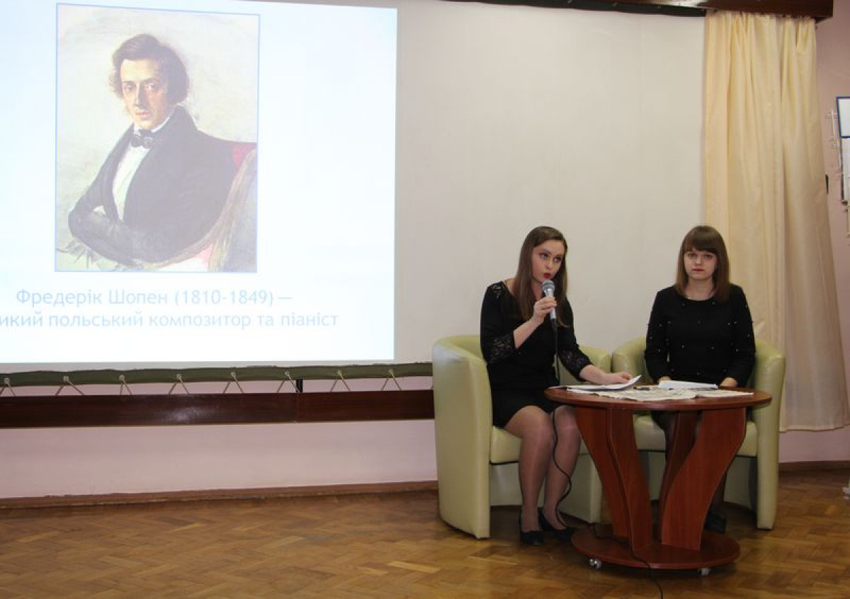 Цікаві факти життєвої і творчої біографії Фредеріка Шопена прозвучали з уст ведучих музичної години – Олени Курило та Інни Ковальчук, працівників відділу літератури з питань мистецтва. Їх розповідь була проілюстрована блискучим виконанням вальсів Шопена вихованцями дитячої музичної школи №1 імені Фредеріка Шопена Верзун-Ролінгер Терезою, Шевчук Аліною (викладач – Ірина Циганкова), Телешовою Юнією (викладач – Ольга Козирська). Мазурку ор-67 виконала Анастасія Собко, також учениця Ірини Вадимівни Циганкової. Вокальний твір Шопена „Бажання” („Якби у небі сонечком стала”) на слова Стефана Вітвіцького прозвучала польською мовою студентка Східноєвропейського університету імені Лесі Українки Оксана Бардабуш (клас викладача Василя Чепелюка, концертмейстер – Алла Родзь).