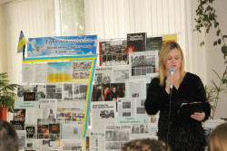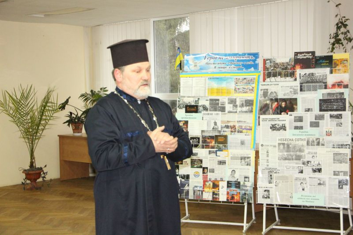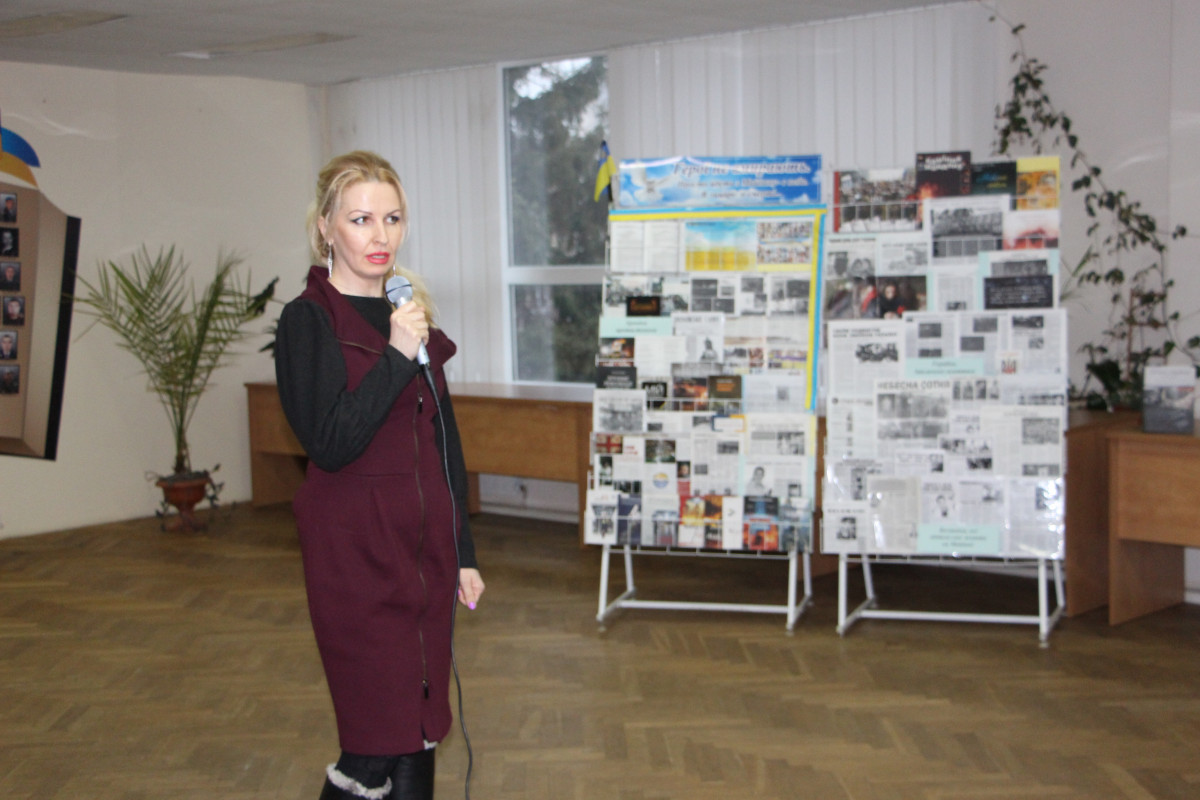 Ведучі години-реквієму – Олена Сільчук та Клавдія Гайтрова – представили увазі присутніх книжкову виставку «Герої не вмирають. Просто йдуть з Майдану – в небо. В лицарі – зі смерті».