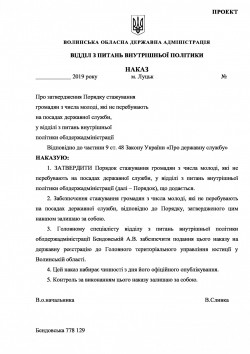 24 травня 2019, 14:03 останні оновлення: 31 травня 2019 Проект наказу про стажування у відділі з питань внутрішньої політики облдержадміністрації