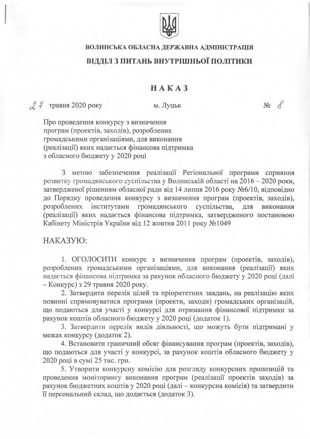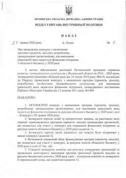 Відділ з питань внутрішньої політики Волинської обласної державної адміністрації оголошує конкурс програм (проектів, заходів), розроблених громадськими організаціями, для виконання (реалізації) яких надаватиметься фінансова підтримка за рахунок коштів обласного бюджету у 2020 році.