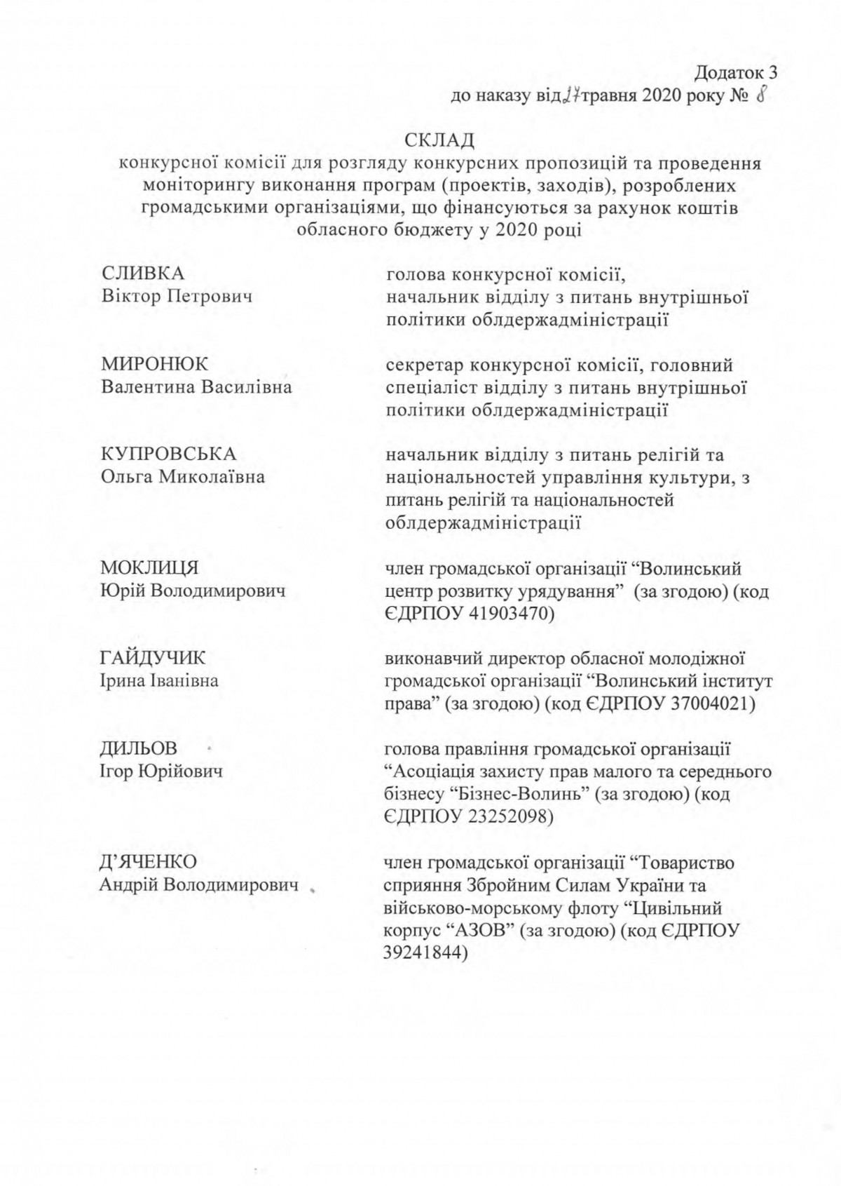 Конкурсні пропозиції приймаються до 25 червня 2020 року (12:00), щоденно, крім суботи та неділі, за адресою: м. Луцьк, Київський майдан, 9, каб. 619, з 8.00 до 17.00, у п’ятницю: з 8.00 до 15.00, перерва з 13.00 до 14.00. За додатковою інформацією звертатись до Сливки Віктора Петровича, голови конкурсної комісії, начальника відділу з питань внутрішньої політики облдержадміністрації, тел.: 778 238.