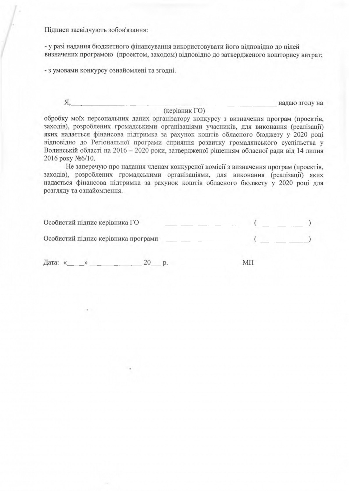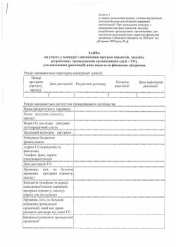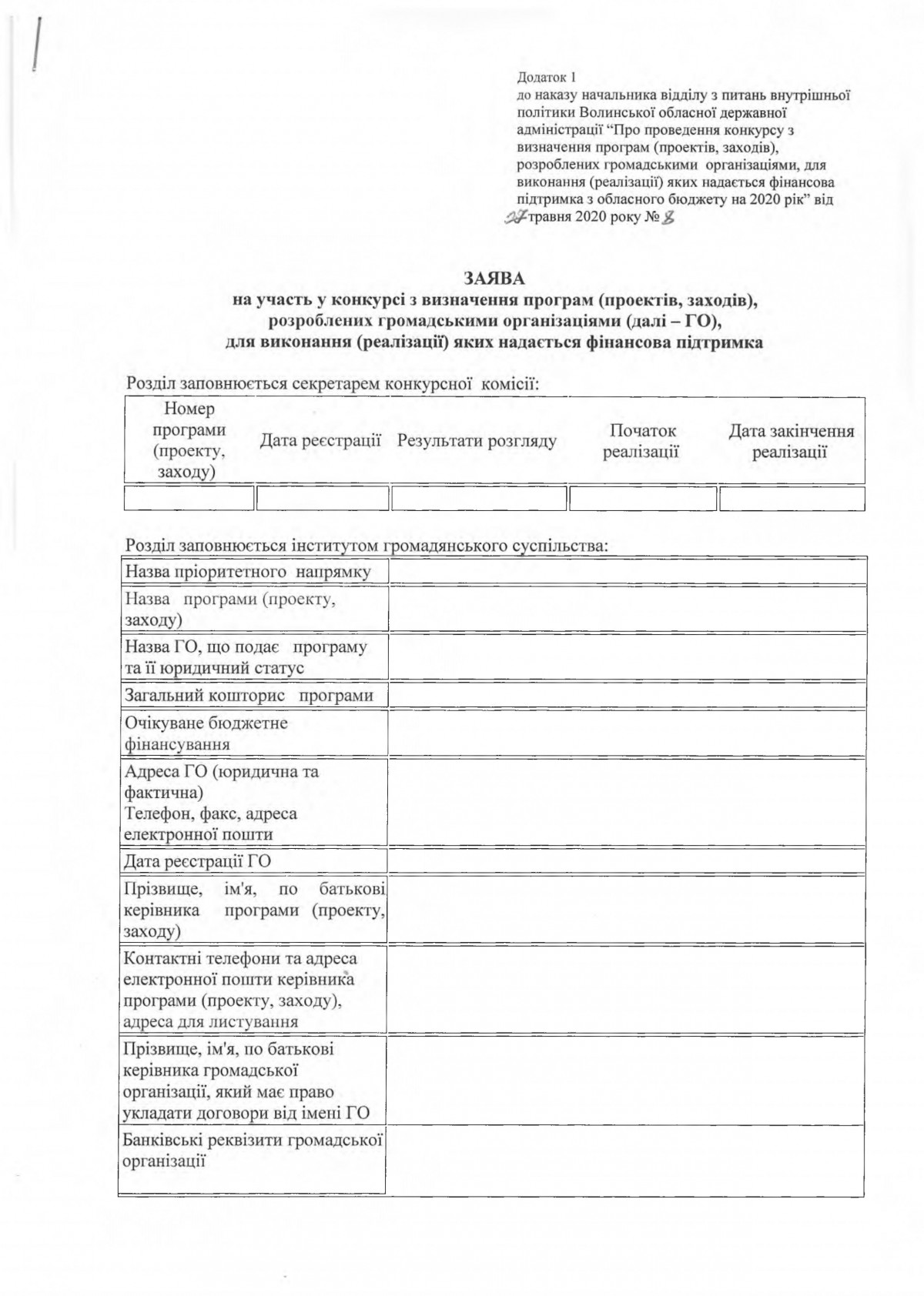 1) заяву про участь у конкурсі, складену за формою 1, що затверджена наказом начальника відділу з питань внутрішньої політики Волинської обласної державної адміністрації “Про проведення конкурсу з визначення програм (проектів, заходів), розроблених громадськими організаціями, для виконання (реалізації) яких надається фінансова підтримка з обласного бюджету на 2020 рік” від 27 травня 2020 року №08, із зазначенням найменування інституту громадянського суспільства та назви програми (проекту, заходу) за підписом керівника або уповноваженої особи інституту громадянського суспільства, скріпленим печаткою інституту (у разі наявності);