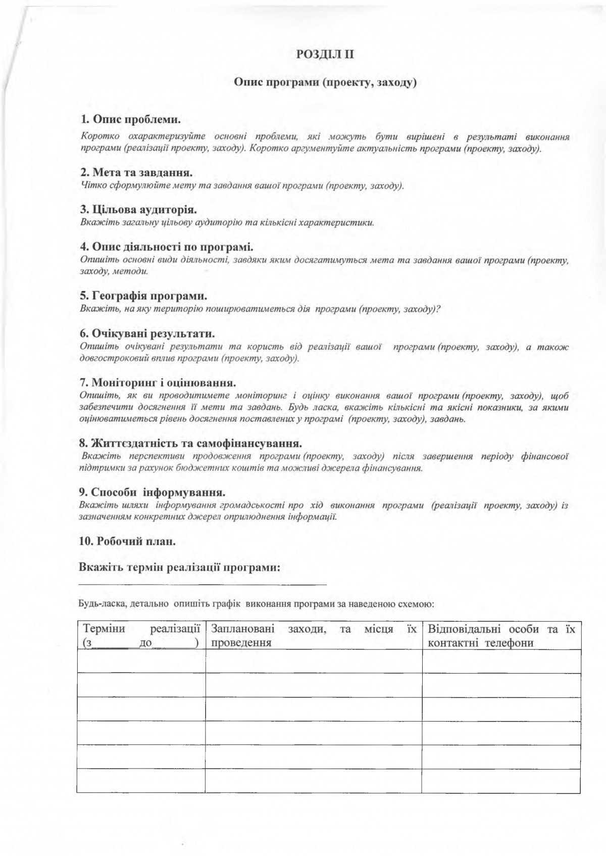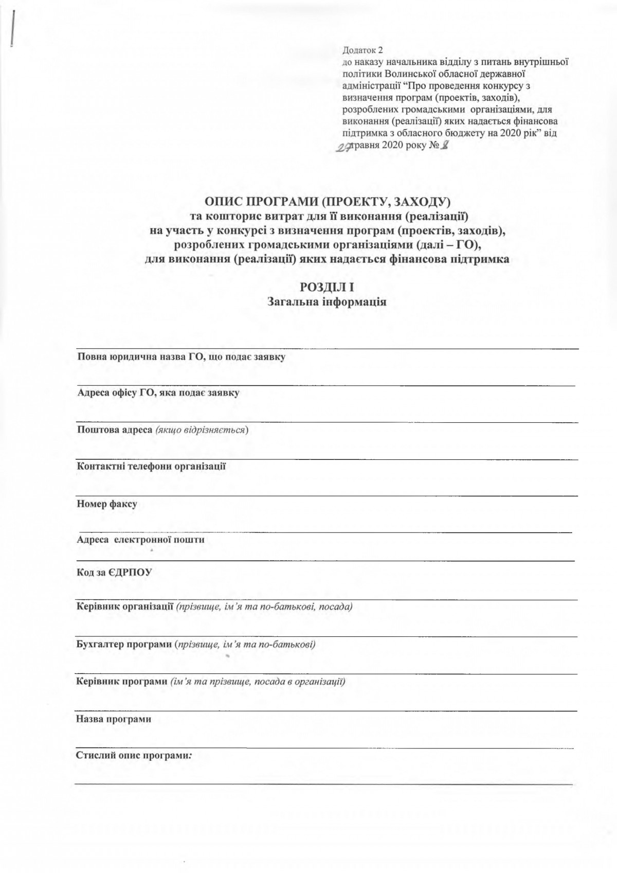 2) опис програми (проекту, заходу) та кошторис витрат, необхідних для виконання (реалізації) програми (проекту, заходу), за формою, що затверджена наказом начальника відділу з питань внутрішньої політики Волинської обласної державної адміністрації “Про проведення конкурсу з визначення програм (проектів, заходів), розроблених громадськими організаціями, для виконання (реалізації) яких надається фінансова підтримка з обласного бюджету на 2020 рік” від 27 травня 2020 року №08. Опис програми (проекту, заходу) повинен містити мету і завдання, план виконання із зазначенням строків та відповідальних виконавців на кожному етапі, очікувані результати та конкретні результативні показники виконання (реалізації) програми (проекту, заходу), інформацію про цільову аудиторію, залучені до виконання (реалізації) програми (проекту, заходу) інші інститути громадянського суспільства, способи інформування громадськості про хід виконання (реалізації) програми (проекту, заходу), детальний розрахунок витрат та джерела фінансування;