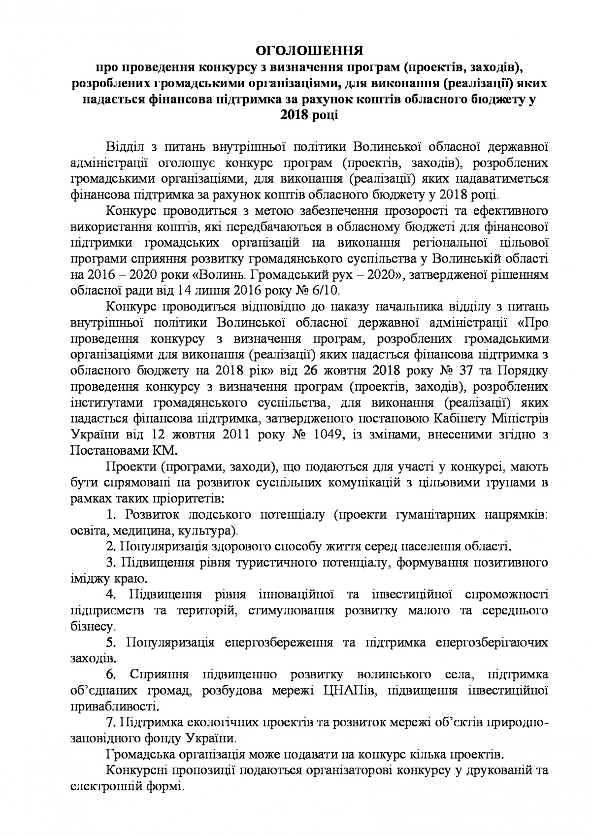 Оголошення про проведення конкурсу з визначення програм (проектів, заходів), розроблених громадськими організаціями, для виконання (реалізації) яких надається фінансова підтримка за рахунок коштів обласного бюджету у 2018 році