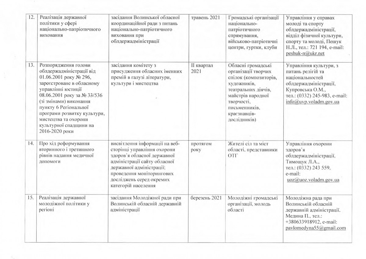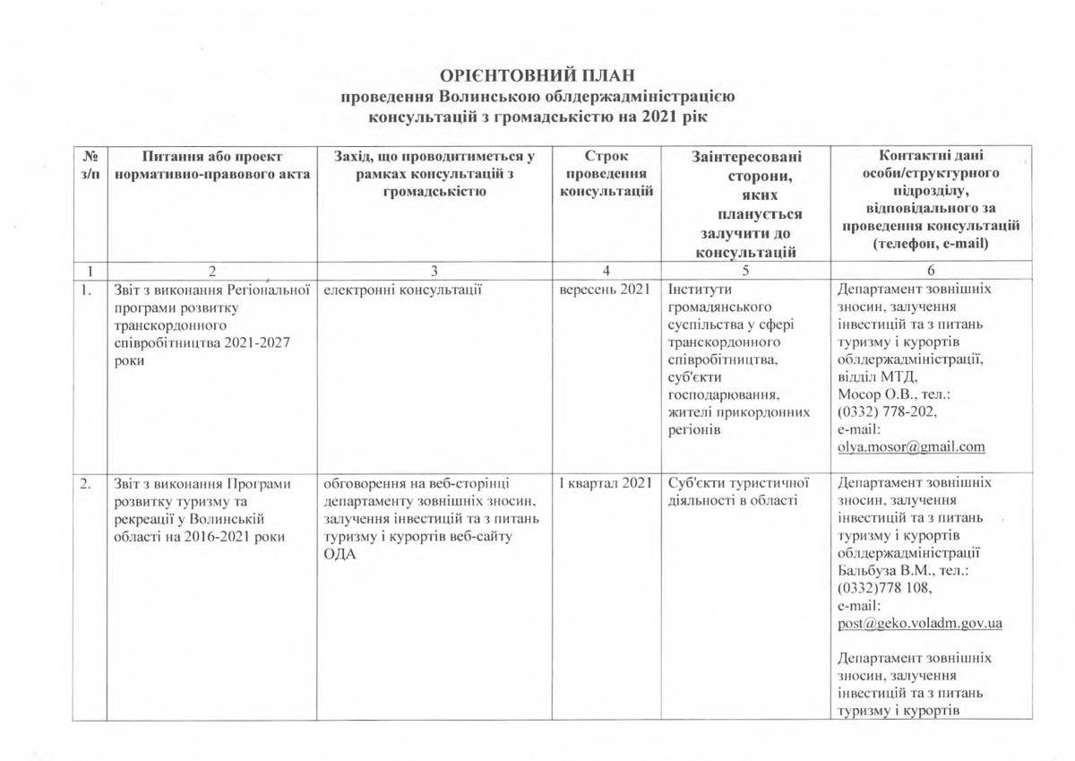 29 грудня 2020, 09:15 останні оновлення: 10 лютого 2022 Орієнтовний план проведення Волинською облдержадміністрацією консультацій з громадськістю на 2021 рік