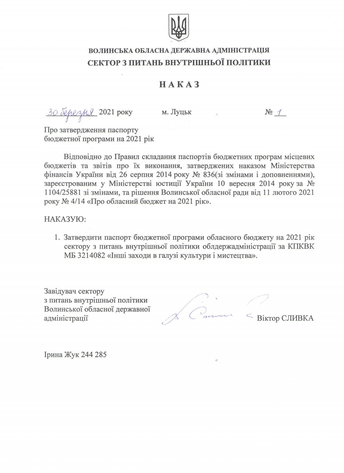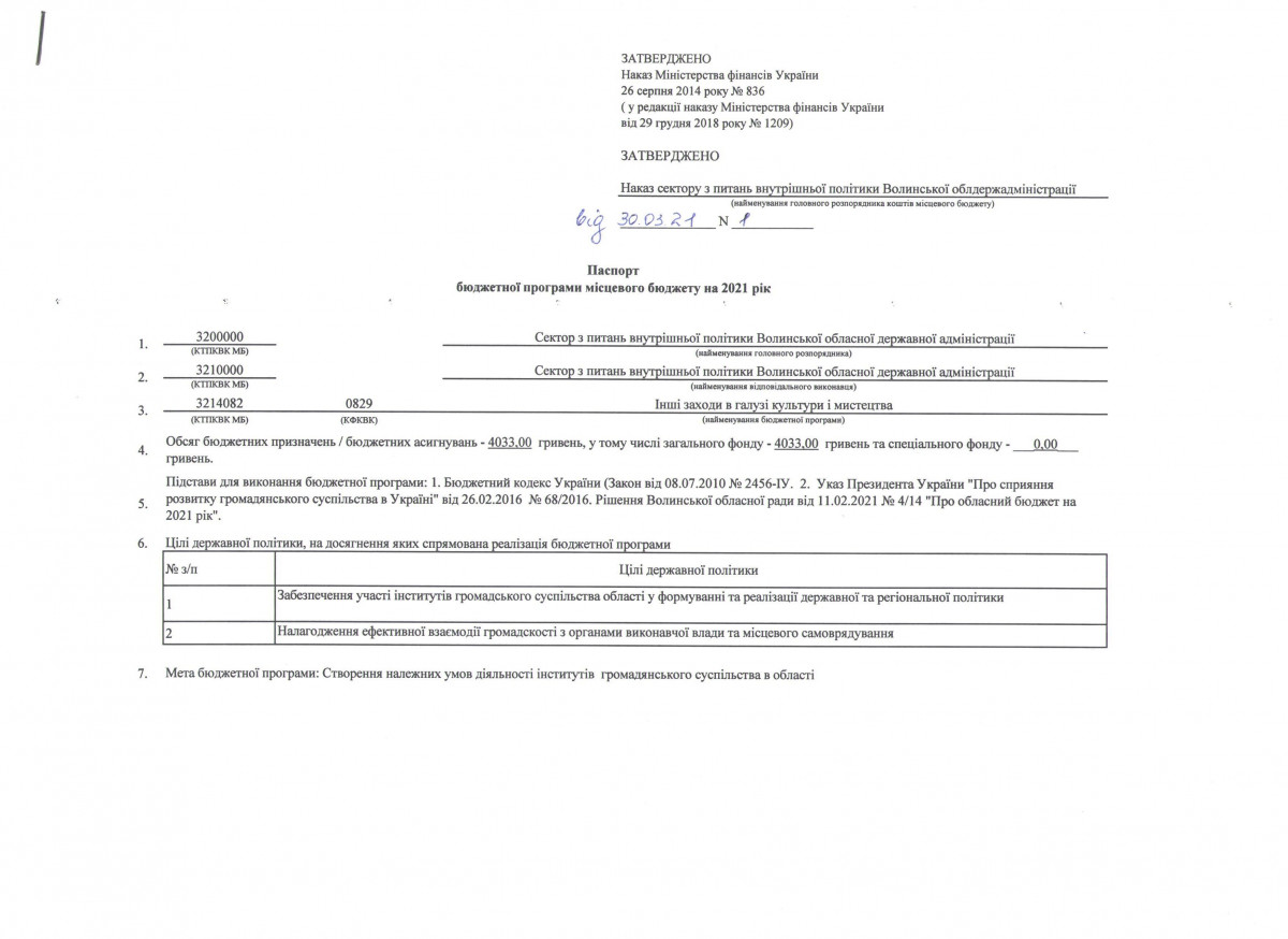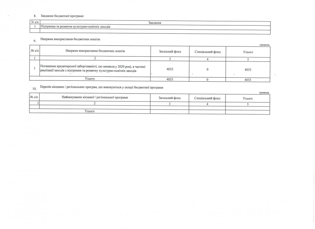 30 березня 2021, 09:39 останні оновлення: 20 квітня 2021 Паспорт бюджетної програми місцевого бюджету "Інші заходи в галузі культури і мистецтва" на 2021 рік