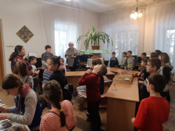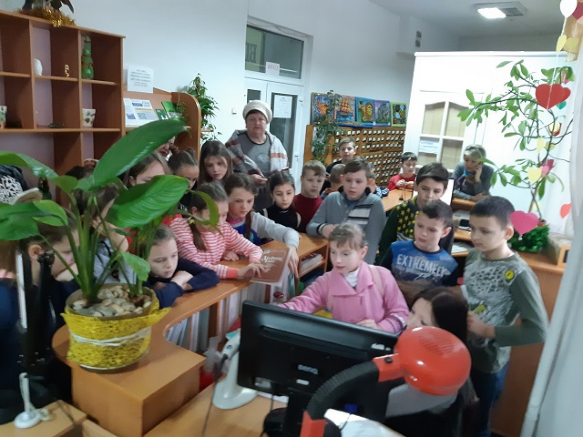 Знайомство школярів із «царством книги» розпочалося з цікавої екскурсії книгозбірнею, перегляду картин виставок, що експонуються у холі та читальному залі.