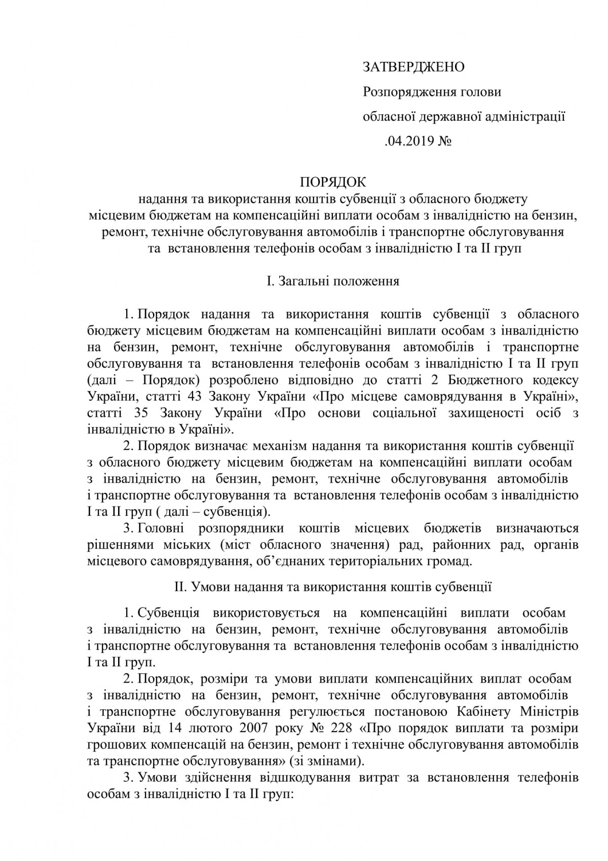Порядок надання та використання коштів субвенції з обласного бюджету місцевим бюджетам на компенсаційні виплати особам з інвалідністю на бензин, ремонт, технічне обслуговування автомобілів і транспорт