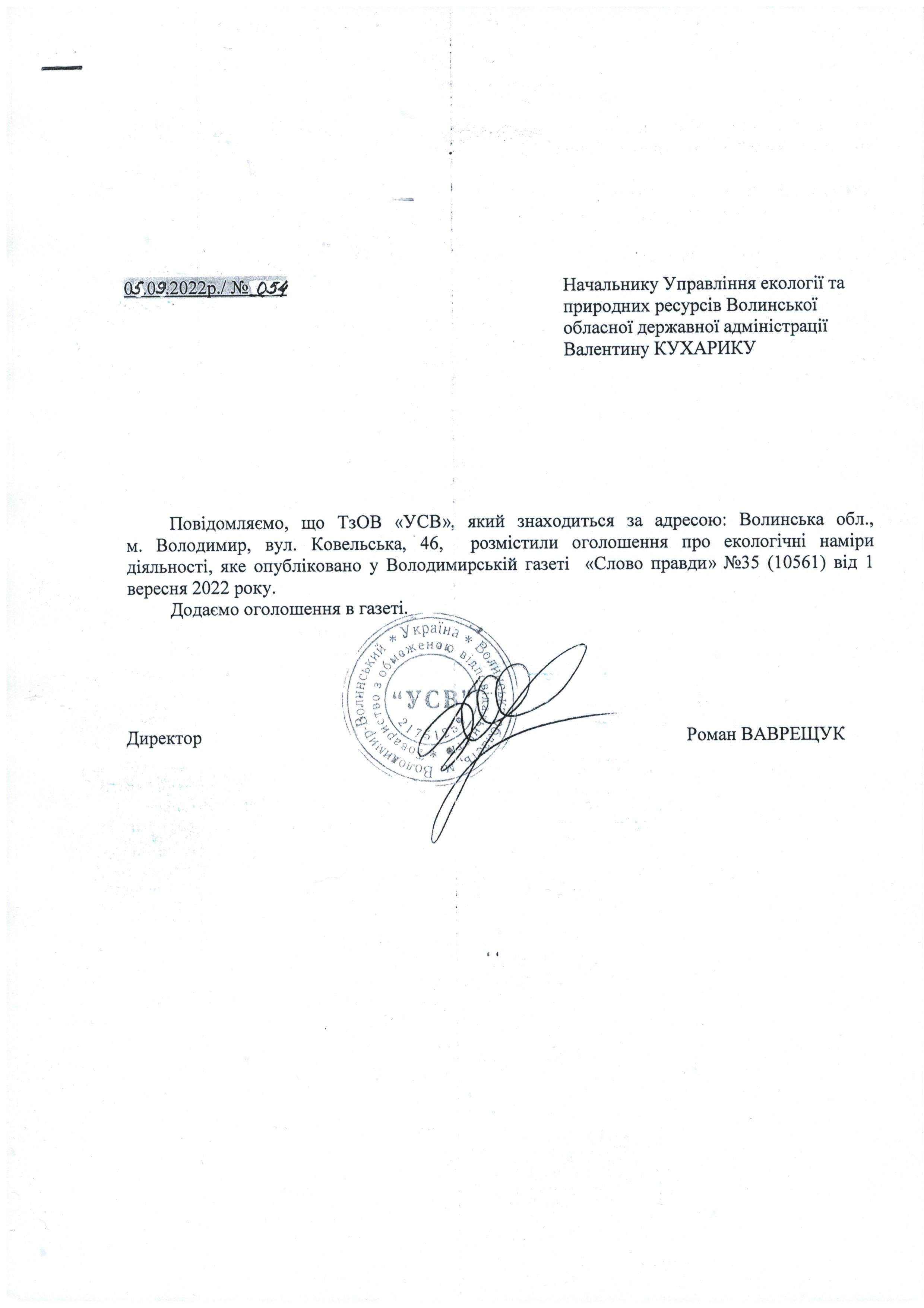 05 вересня 2022, 12:29 останні оновлення: 28 лютого 2025 Повідомлення про намір отримати дозвіл на викиди ТзОВ " Універсальний сервіс Ваврещуків " Лист Оголошення