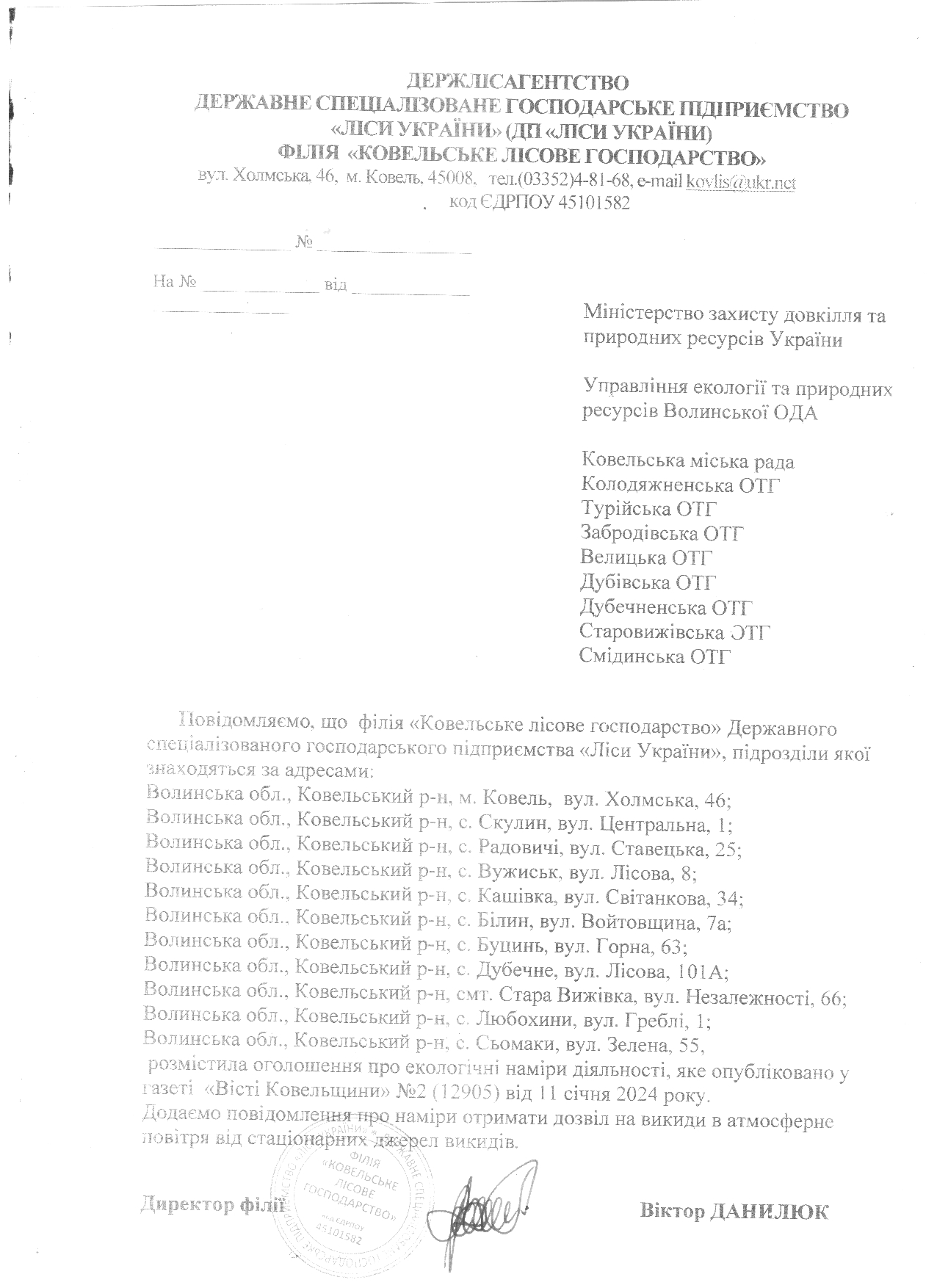 15 січня 2024, 11:00 останні оновлення: 28 лютого 2025 Повідомлення про намір отримати дозвіл на викиди Філія "Ковельське лісове господарство" ДП "Ліси України" Лист Оголошення