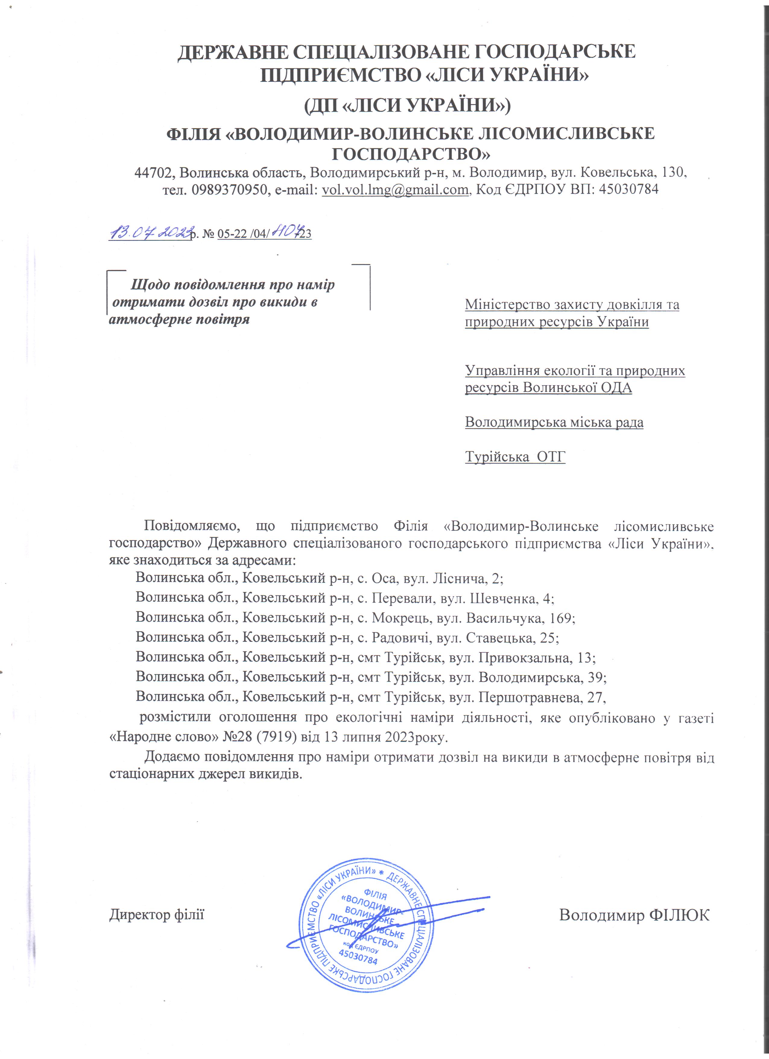 14 липня 2023, 14:23 останні оновлення: 28 лютого 2025 Повідомлення про намір отримати дозвіл на викиди Філія «Володимир-Волинське лісомисливське господарство» ДП «Ліси України» Лист Оголошення