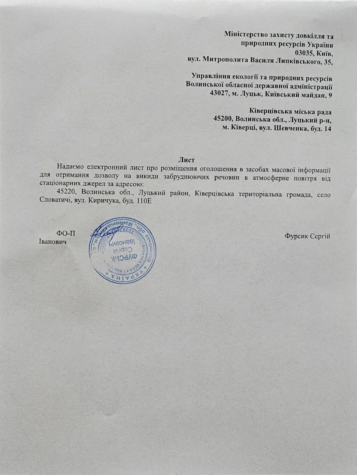 09 серпня 2024, 14:40 останні оновлення: 28 лютого 2025 Повідомлення про намір отримати дозвіл на викиди ФОП Фурсик Сергій Іванович лист оголошення