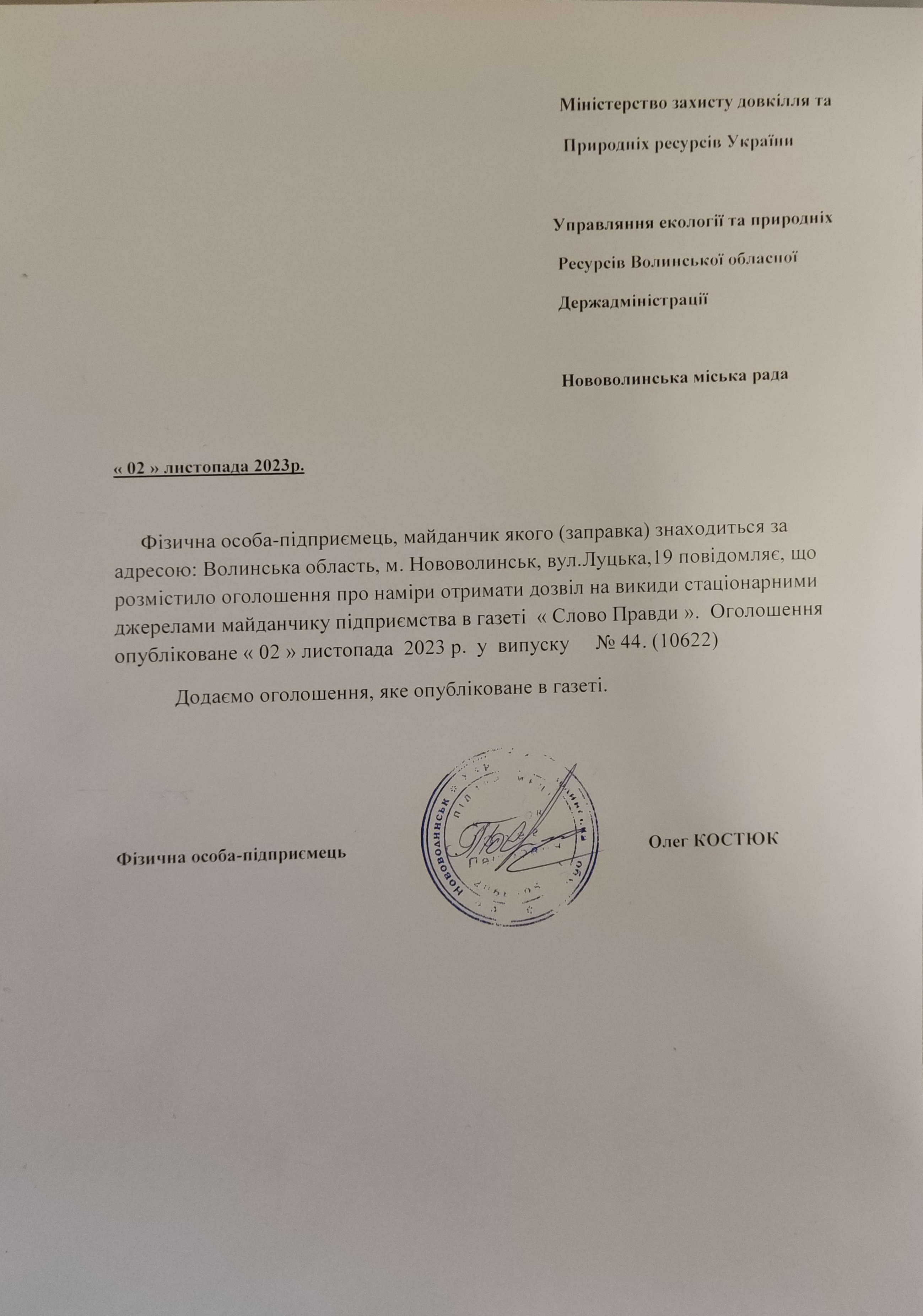 06 листопада 2023, 09:21 останні оновлення: 28 лютого 2025 Повідомлення про намір отримати дозвіл на викиди ФОП Костюк О.П (м. Нововолинськ) лист оголошення