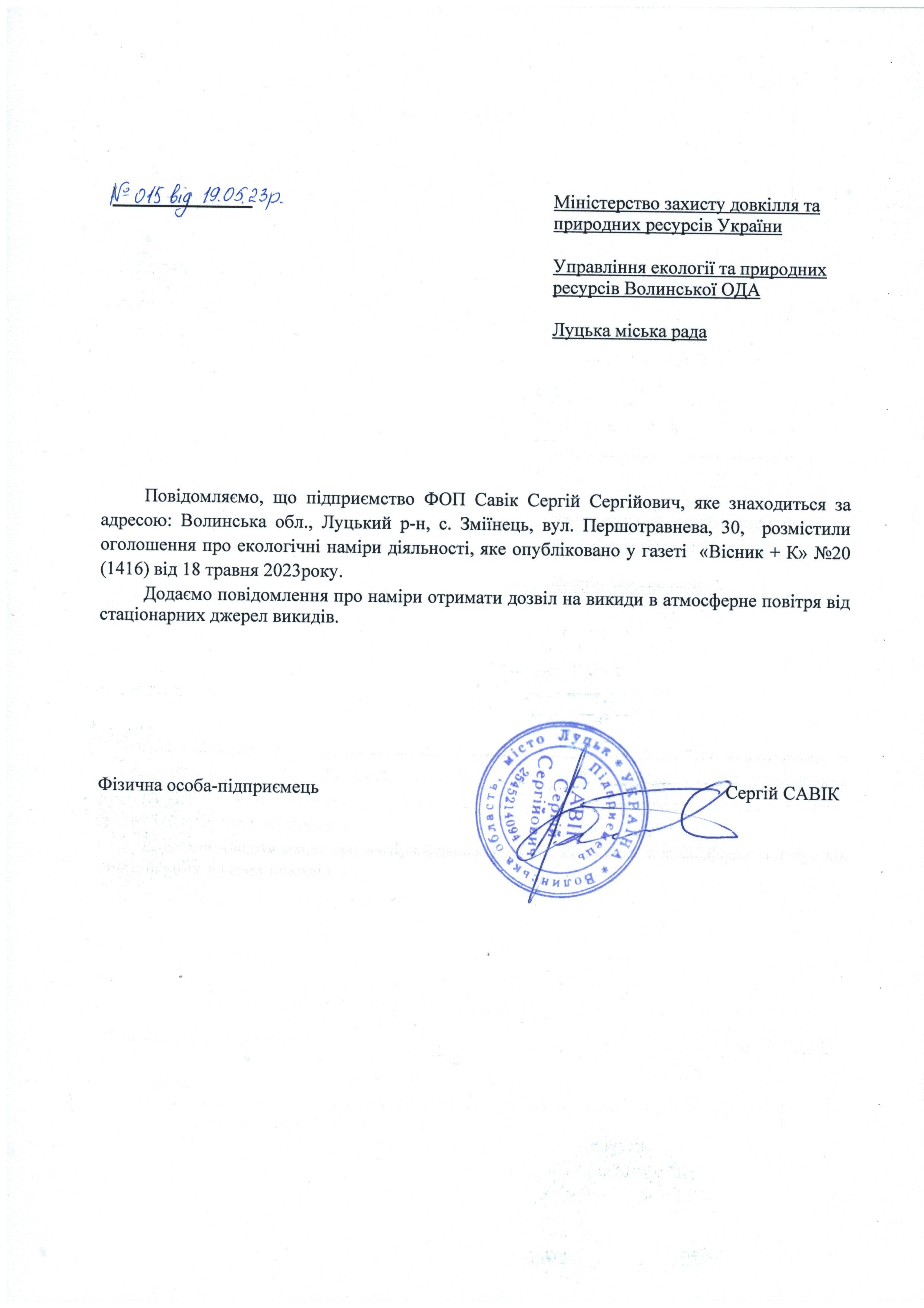 19 травня 2023, 15:44 останні оновлення: 28 лютого 2025 Повідомлення про намір отримати дозвіл на викиди ФОП Савік Сергій Сергійович Лист Оголошення