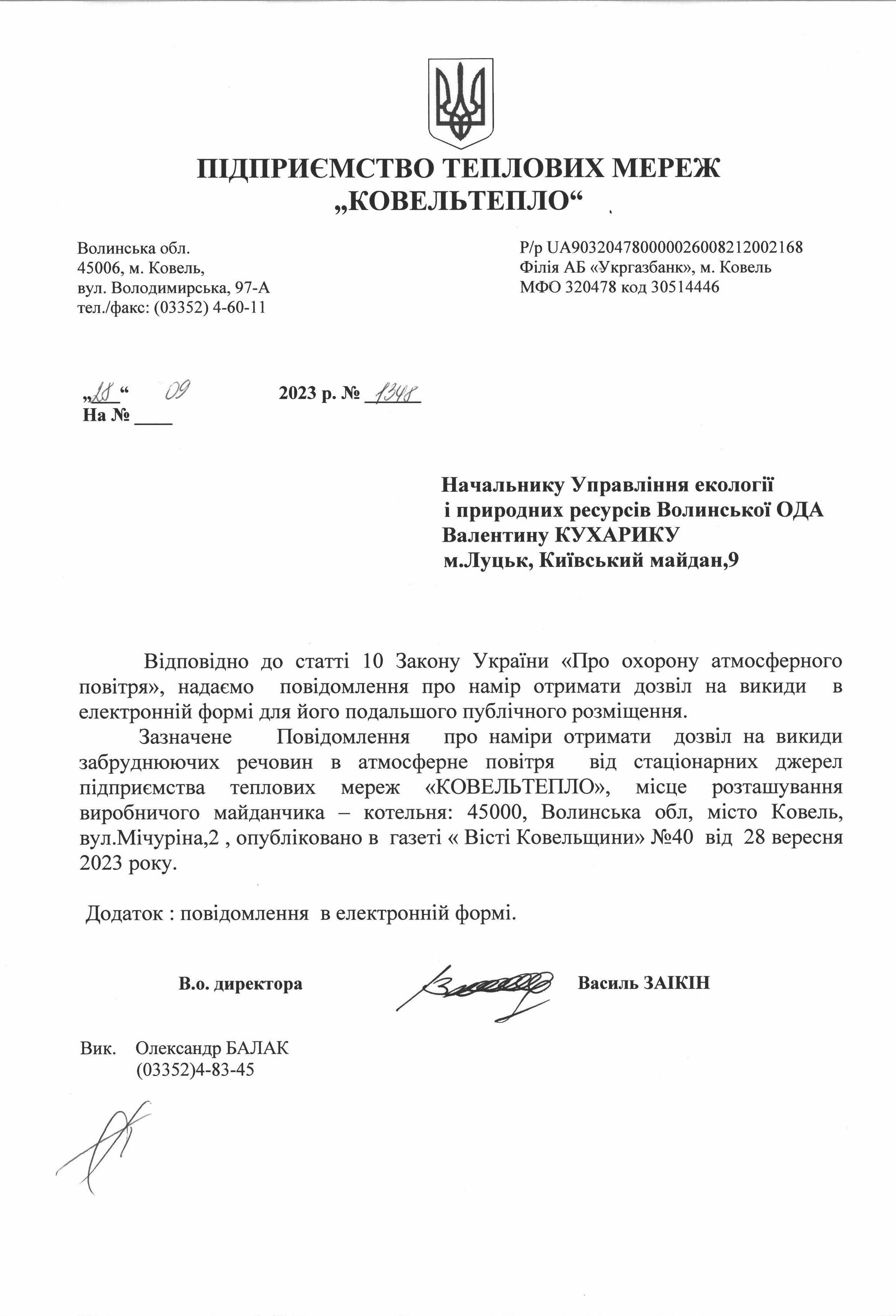 28 вересня 2023, 10:59 останні оновлення: 28 лютого 2025 Повідомлення про намір отримати дозвіл на викиди Підприємство теплових мереж "Ковельтепло" лист оголошення