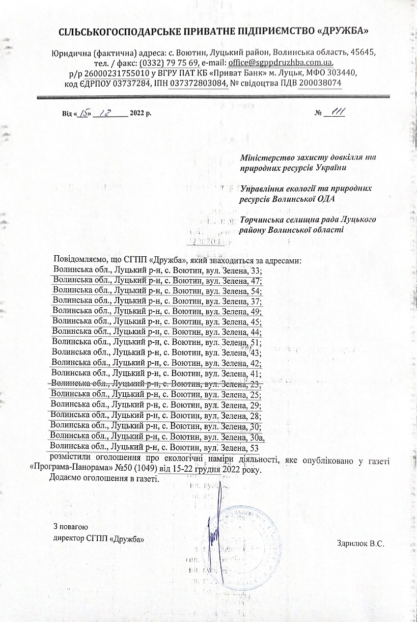 16 грудня 2022, 13:55 останні оновлення: 28 лютого 2025 Повідомлення про намір отримати дозвіл на викиди СГПП «Дружба» Лист Оголошення
