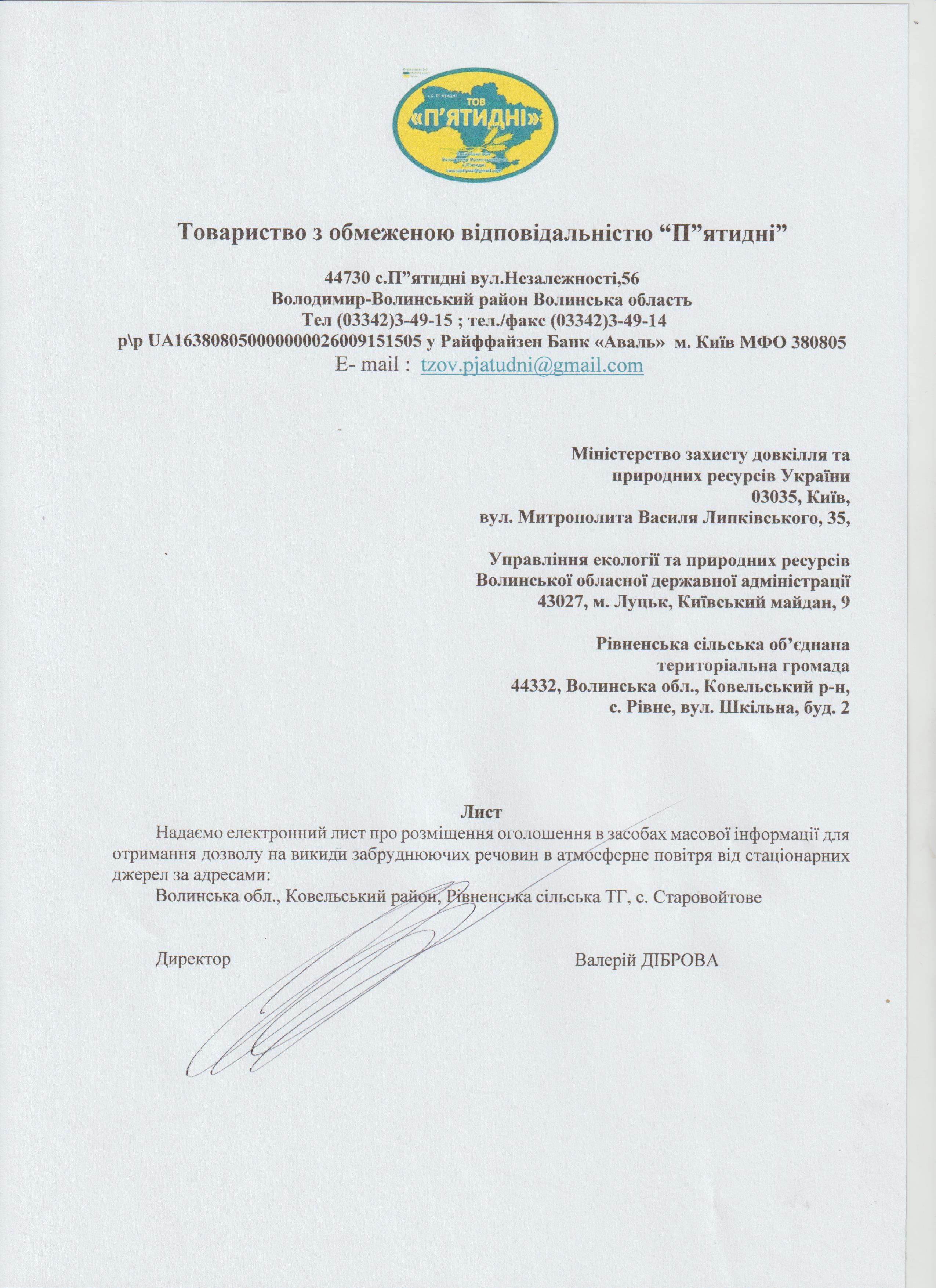11 березня 2024, 11:34 останні оновлення: 28 лютого 2025 Повідомлення про намір отримати дозвіл на викиди ТОВ «П’ЯТИДНІ» Лист Оголошення