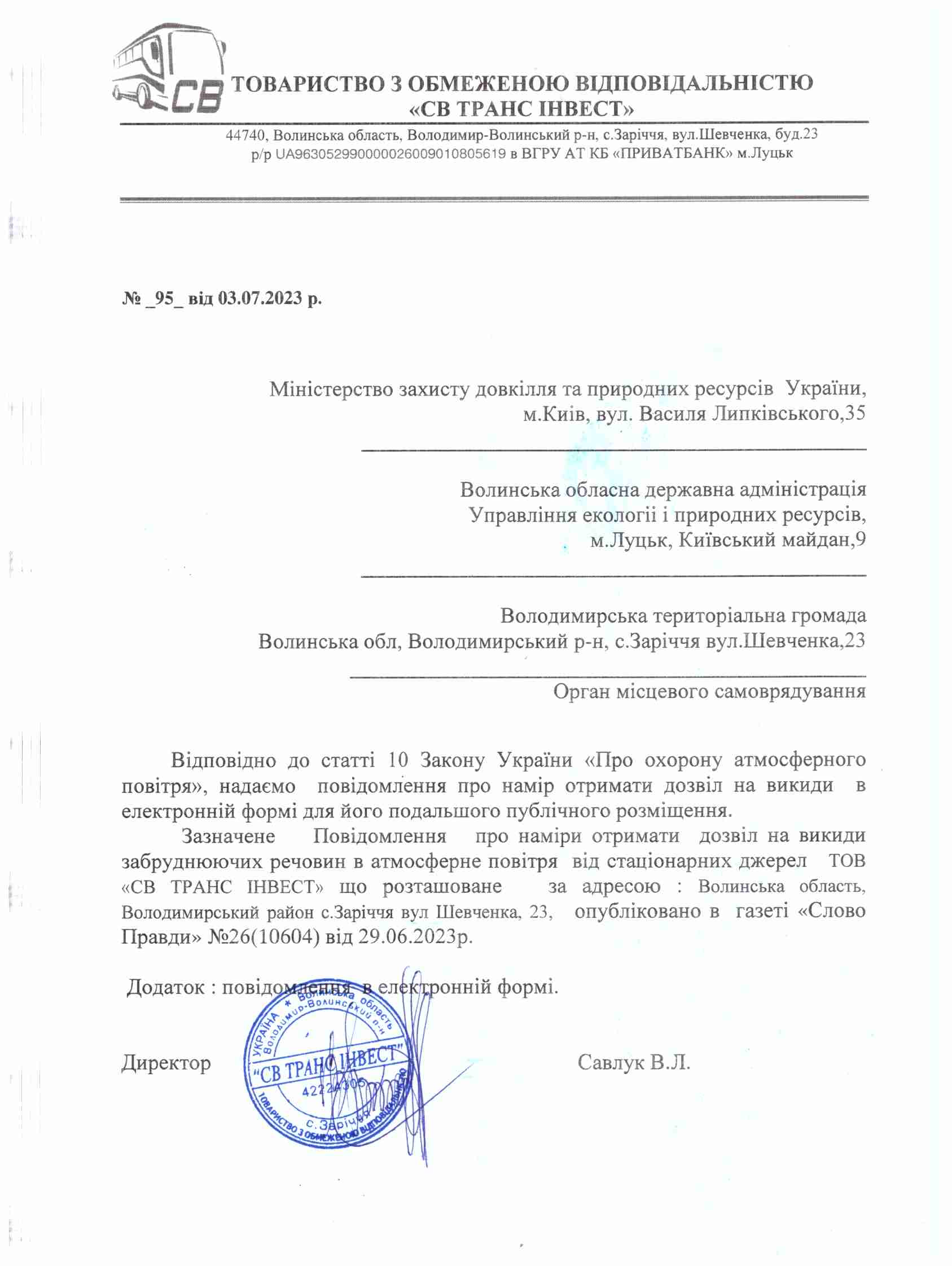 04 липня 2023, 08:28 останні оновлення: 28 лютого 2025 Повідомлення про намір отримати дозвіл на викиди ТОВ "СВ ТРАНС ІНВЕСТ" Лист Оголошення