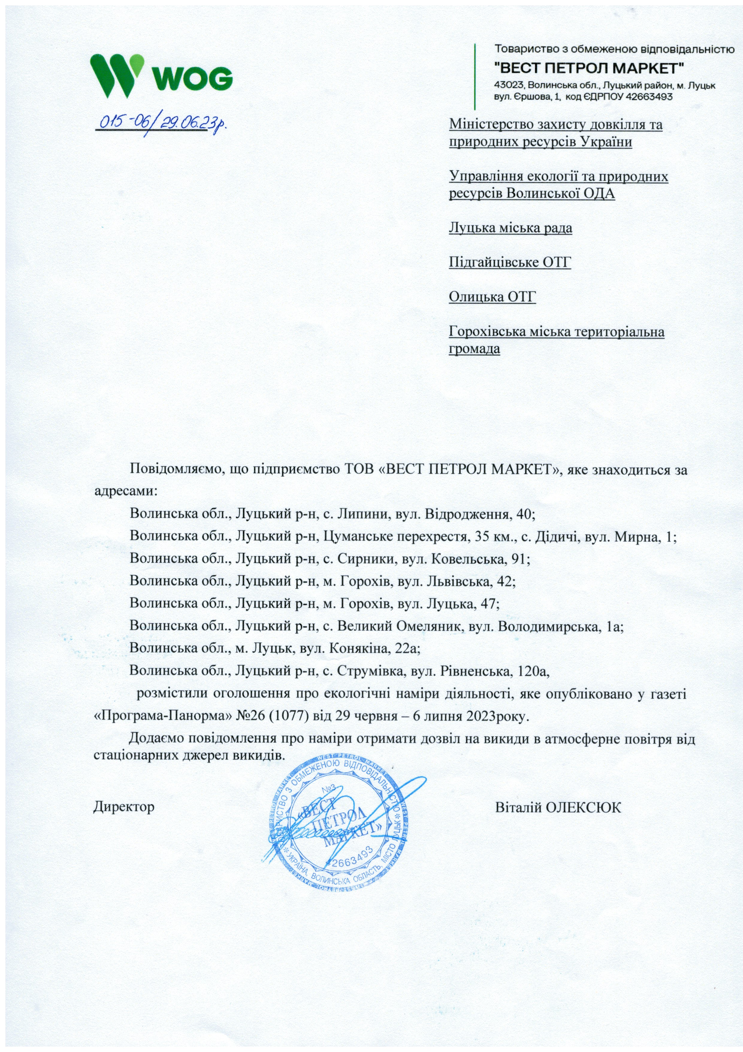 29 червня 2023, 15:54 останні оновлення: 28 лютого 2025 Повідомлення про намір отримати дозвіл на викиди ТОВ «ВЕСТ ПЕТРОЛ МАРКЕТ» Лист Оголошення