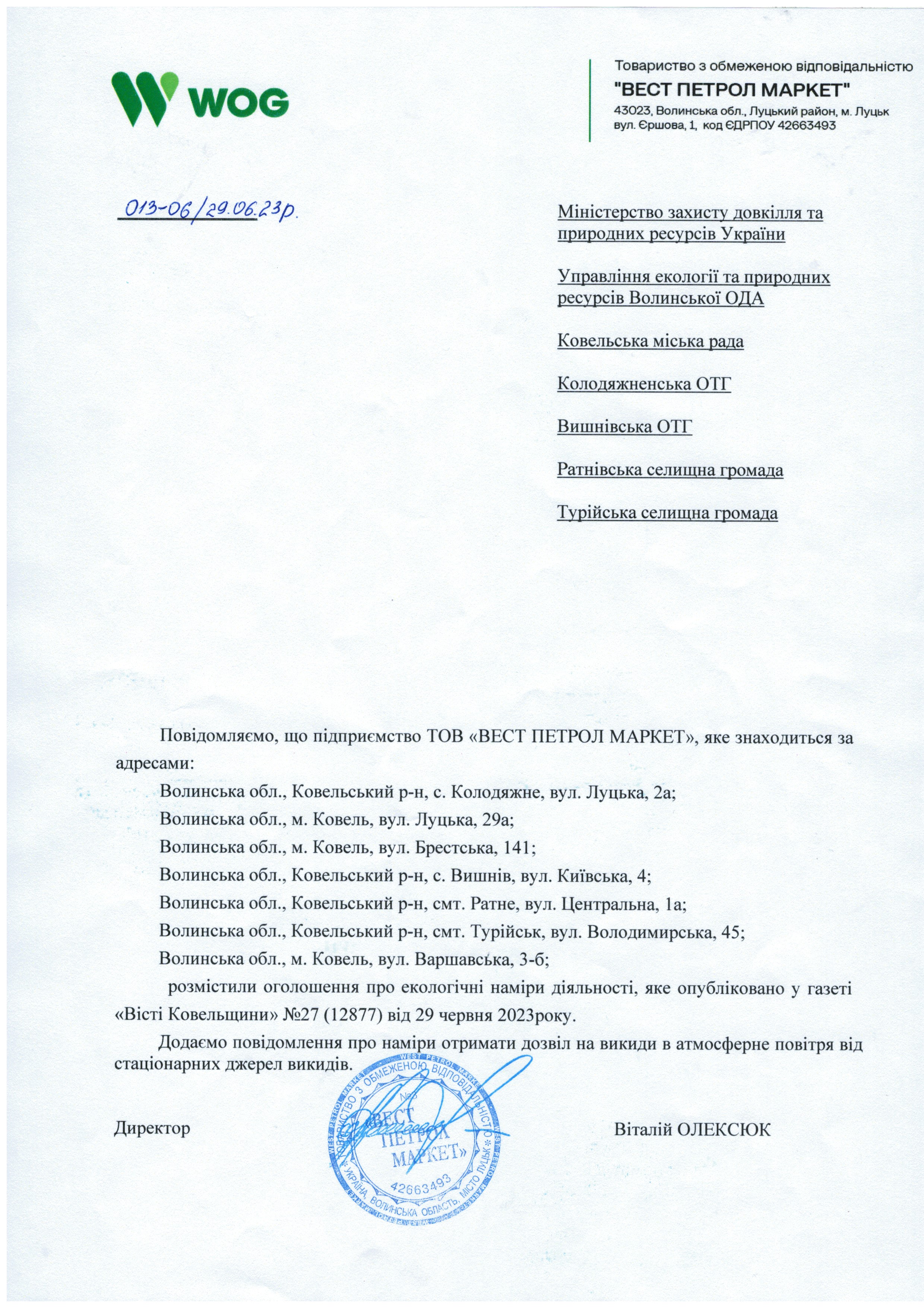 29 червня 2023, 16:05 останні оновлення: 28 лютого 2025 Повідомлення про намір отримати дозвіл на викиди ТОВ «ВЕСТ ПЕТРОЛ МАРКЕТ» Лист Оголошення