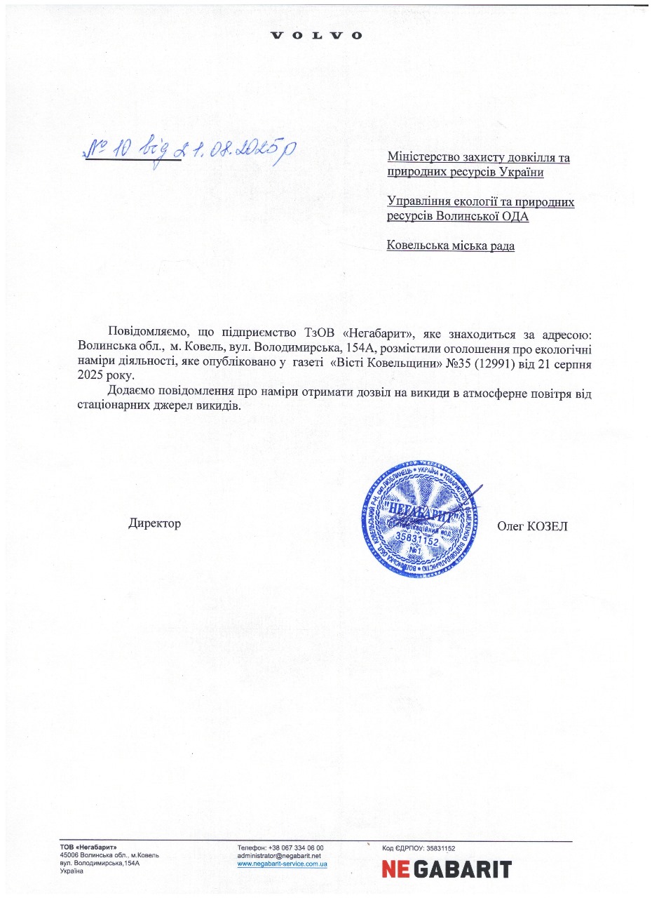 22 серпня 2025, 15:54 останні оновлення: 22 серпня 2025 Повідомлення про намір отримати дозвіл на викиди ТзОВ «Негабарит» Лист Оголошення