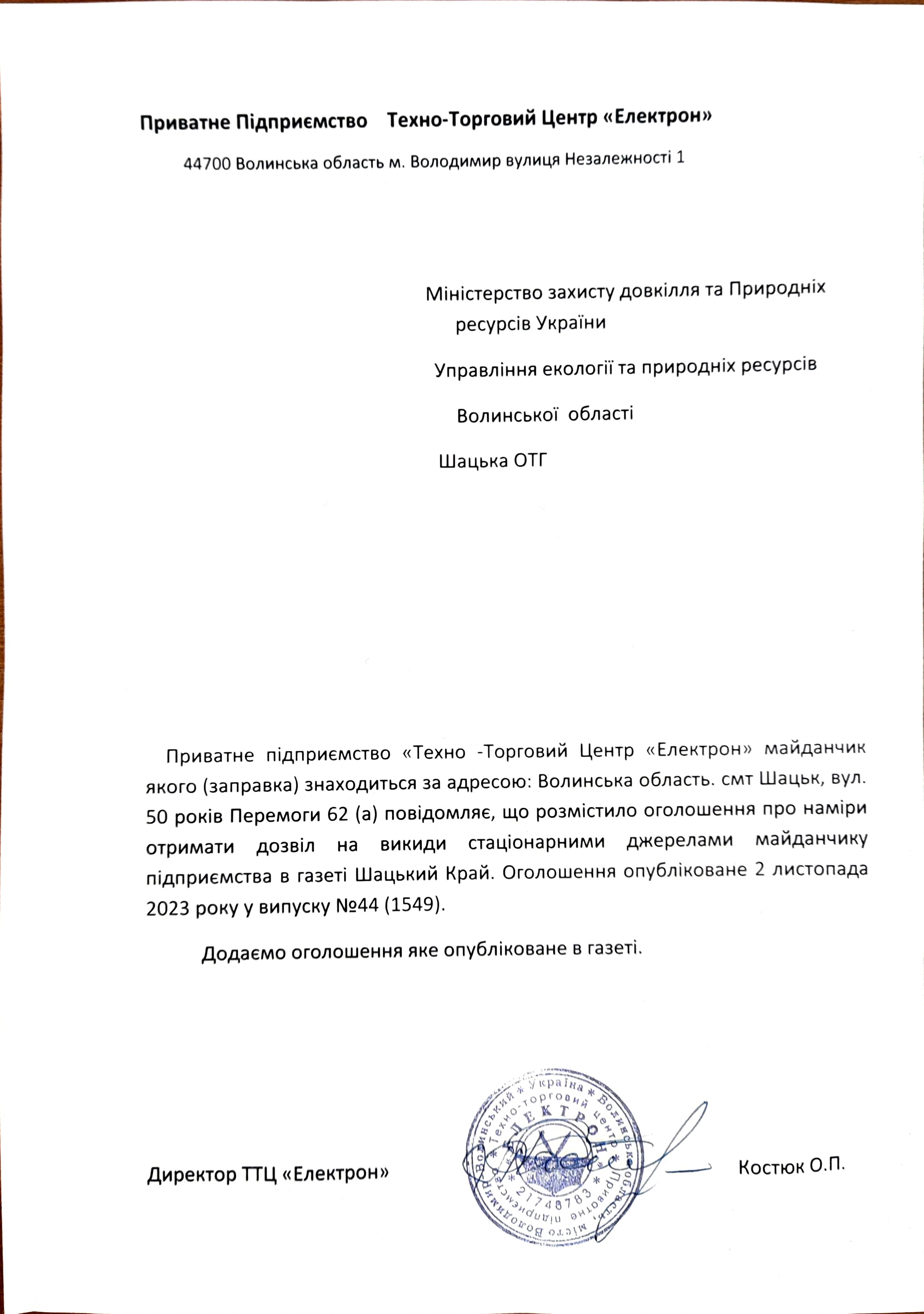 06 листопада 2023, 09:51 останні оновлення: 28 лютого 2025 Повідомлення про намір отримати дозвіл на викиди ПП "ТТЦ "Електрон" лист оголошення