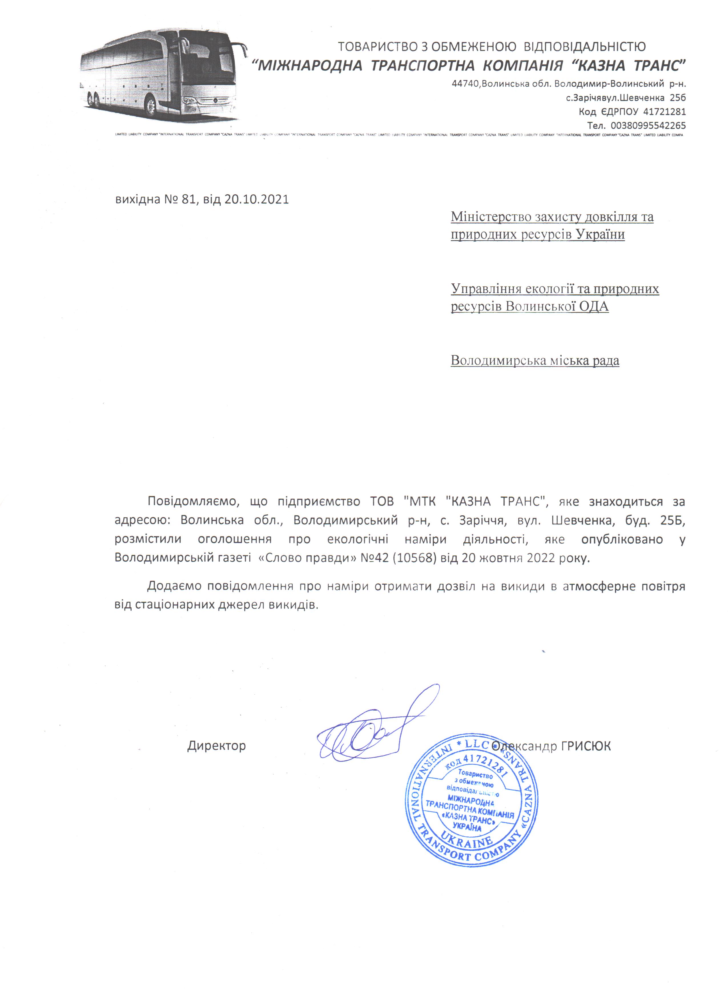 21 жовтня 2022, 11:24 останні оновлення: 28 лютого 2025 Повідомлення про намір отримати дозвіл ТОВ "МТК "КАЗНА ТРАНС" Лист Оголошення