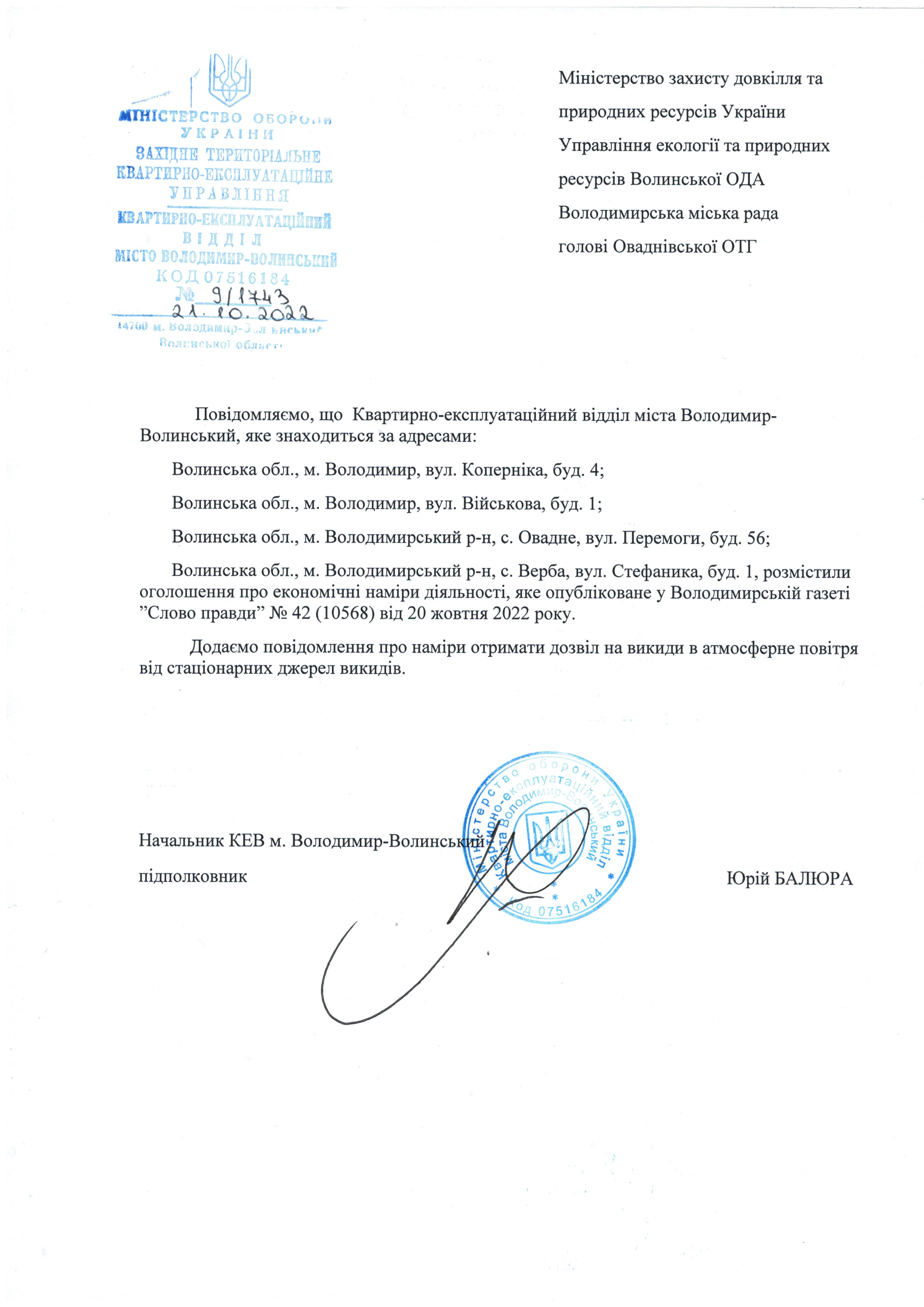 24 жовтня 2022, 10:53 останні оновлення: 28 лютого 2025 Повідомлення про намір отритмати дозвіл на викиди Квартирно-експлуатаційний відділ міста Володимир-Волинський лист оголошення