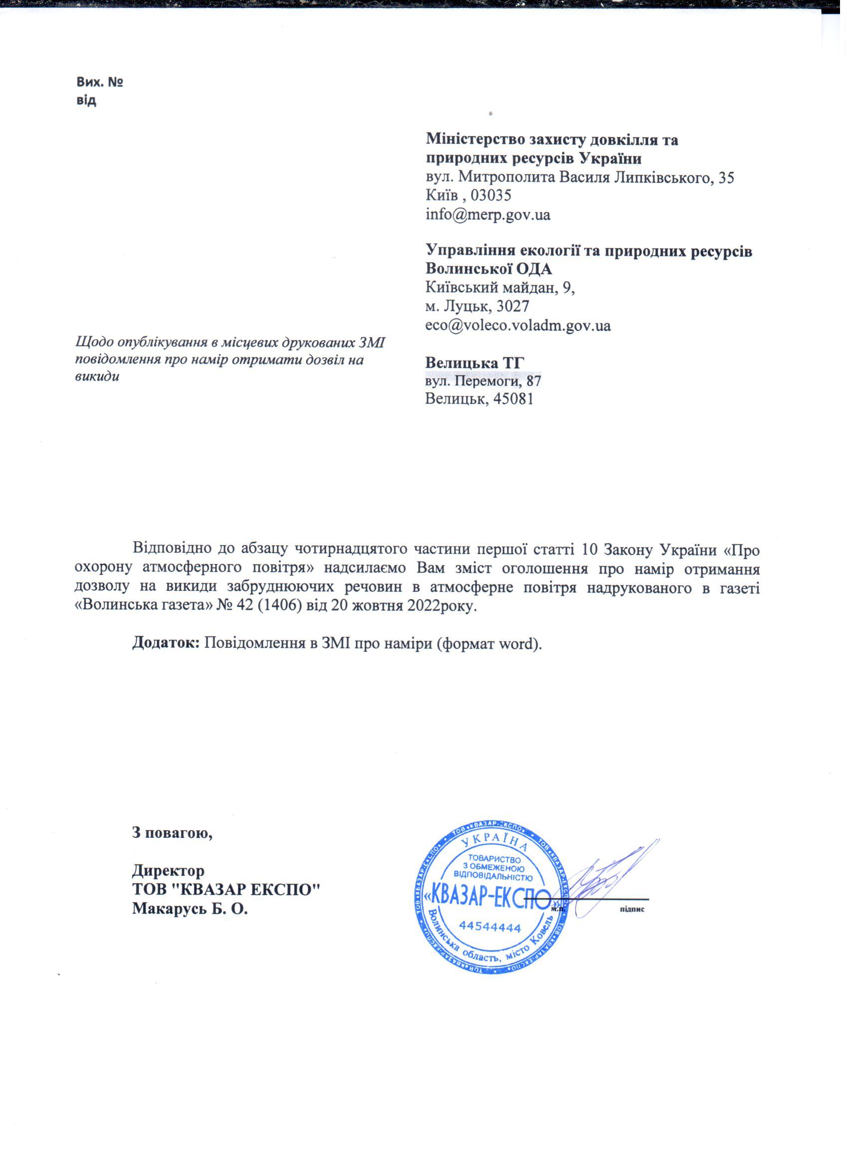 08 листопада 2022, 12:26 останні оновлення: 28 лютого 2025 Повідомлення про намір отримати дозвіл на викиди ТзОВ «КВАЗАР ЕКСПО» Лист Оголошення
