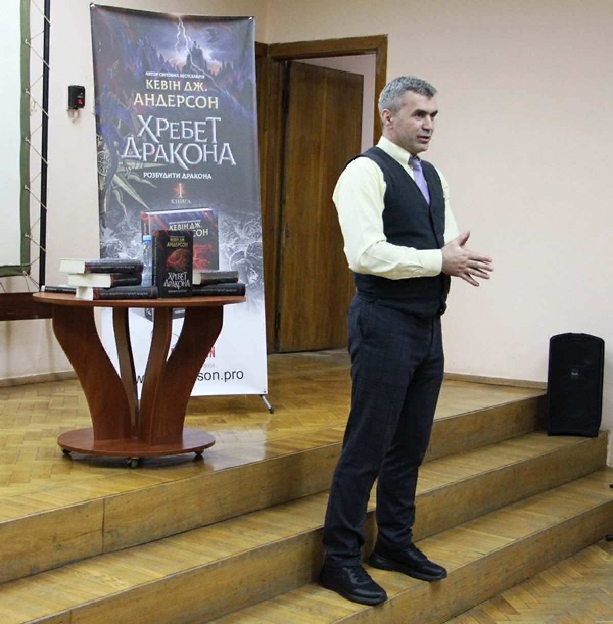 Модераторував подію Владислав Сукенник – директор та головний редактор івано-франківського видавництва «Медіасон», яке отримало права на переклад та видання трилогії Кевіна Андерсона «Розбудити дракона». «Це історія про великий масштабний фантазійний світ, сповнений багатьох речей, паралелі яким кожен може знайти в реальному житті», - зазначив пан Сукенник.