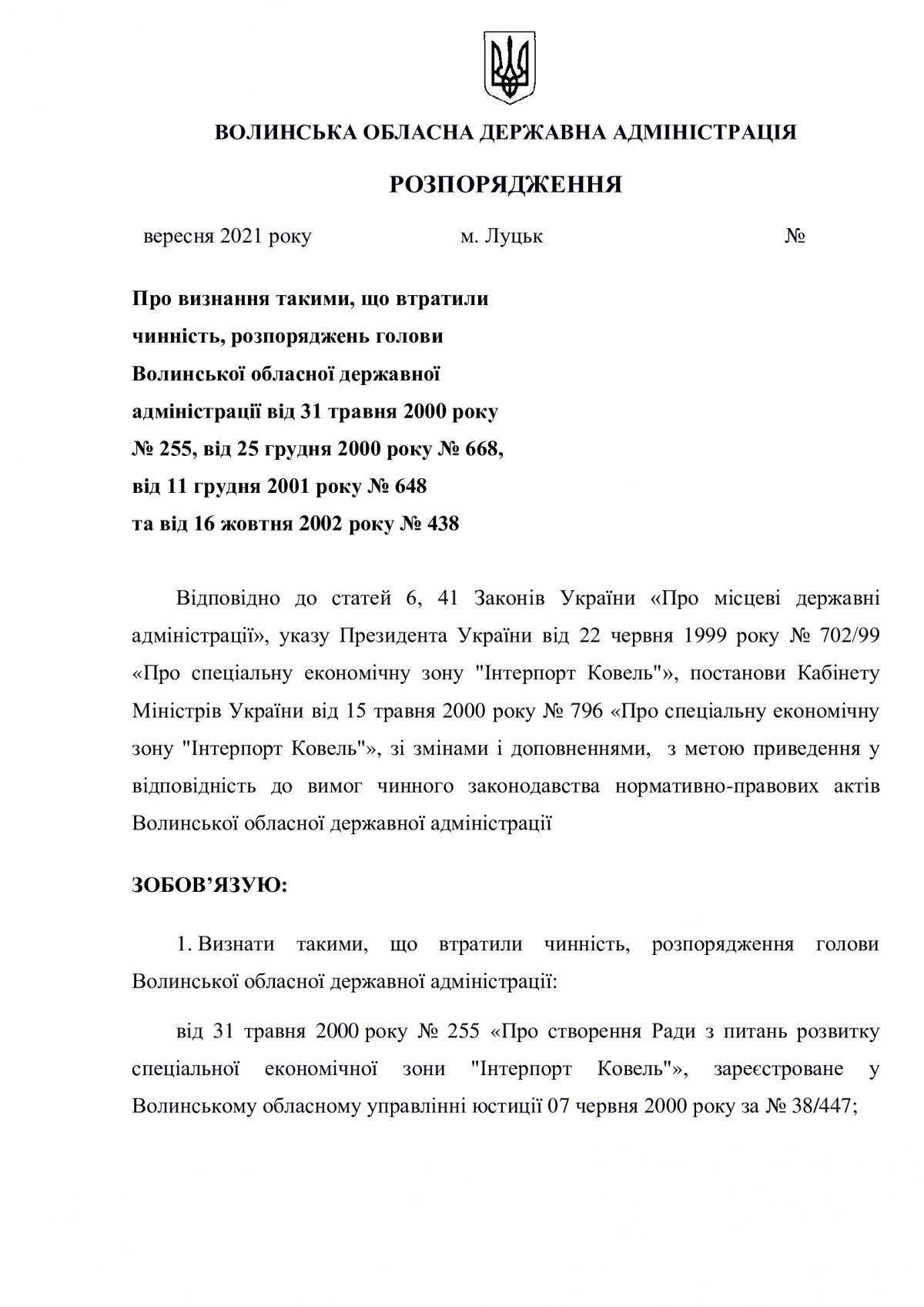 Про визнання такими, що втратили чинність, розпоряджень голови Волинської обласної державної адміністрації від 31 травня 2000 року № 255, від 25 грудня 2000 року № 668, від 11 грудня 2001 року № 6