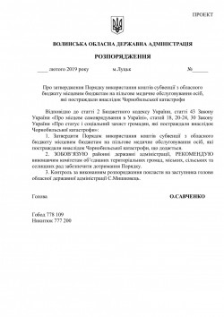 11 лютого 2019, 16:10 останні оновлення: 15 лютого 2019 Про затвердження Порядку використання коштів субвенції з обласного бюджету місцевим бюджетам на пільгове медичне обслуговування осіб, які постраждали внаслідок Чорнобильської катастрофи