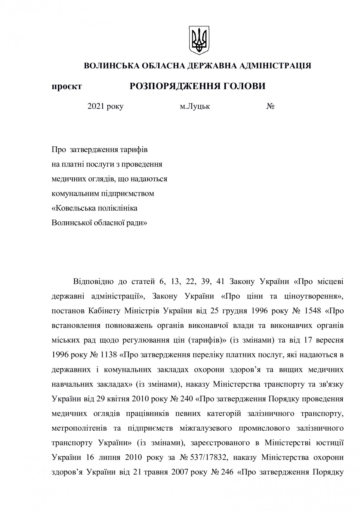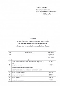 11 лютого 2021, 09:48 останні оновлення: 10 лютого 2022 Про затвердження тарифів на платні послуги з проведення медичних оглядів КП "Ковельська поліклініка Волинської ОР