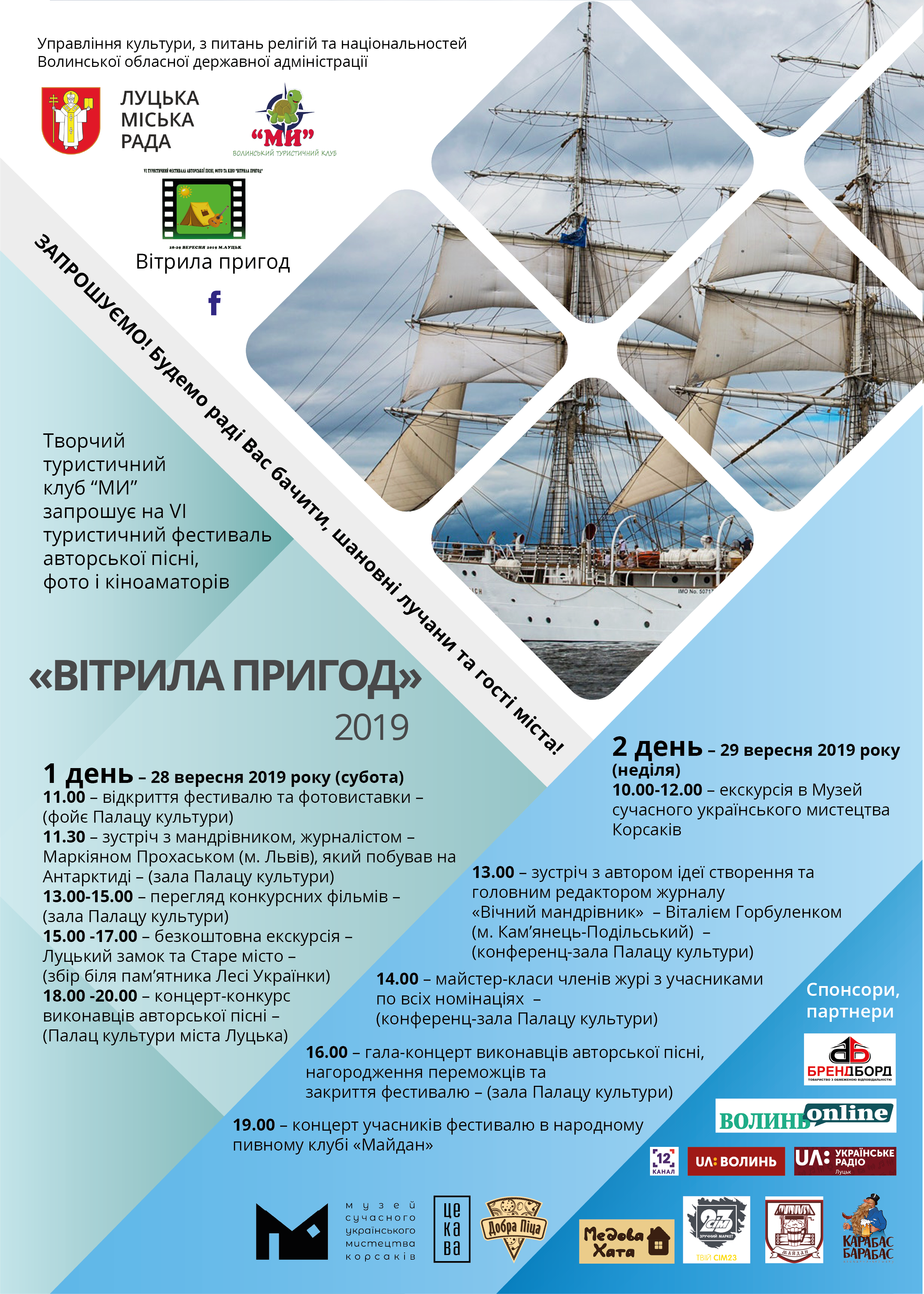 Програма VІ туристичного фестивалю авторської пісні, фото та кіноаматорів «Вітрила пригод» 2019 м. Луцьк