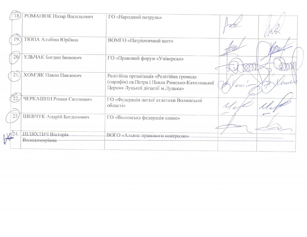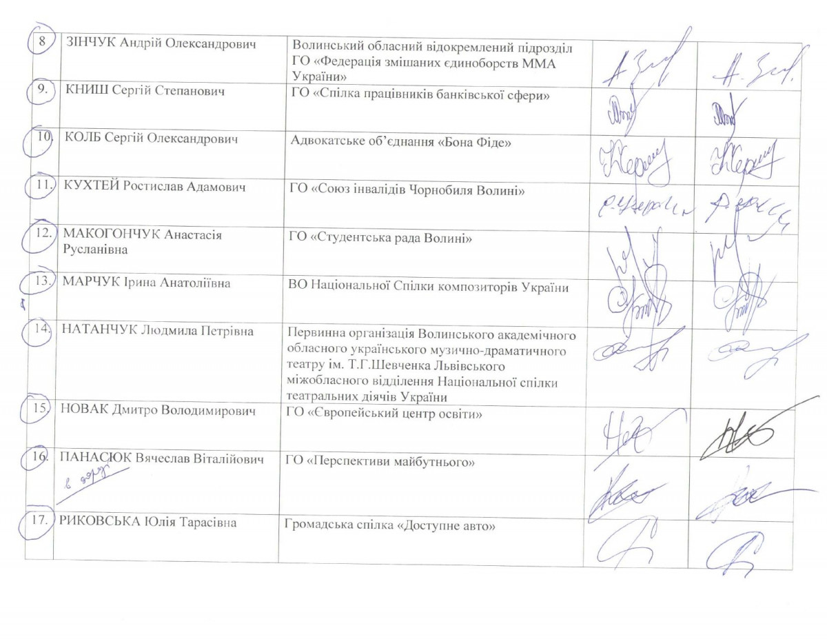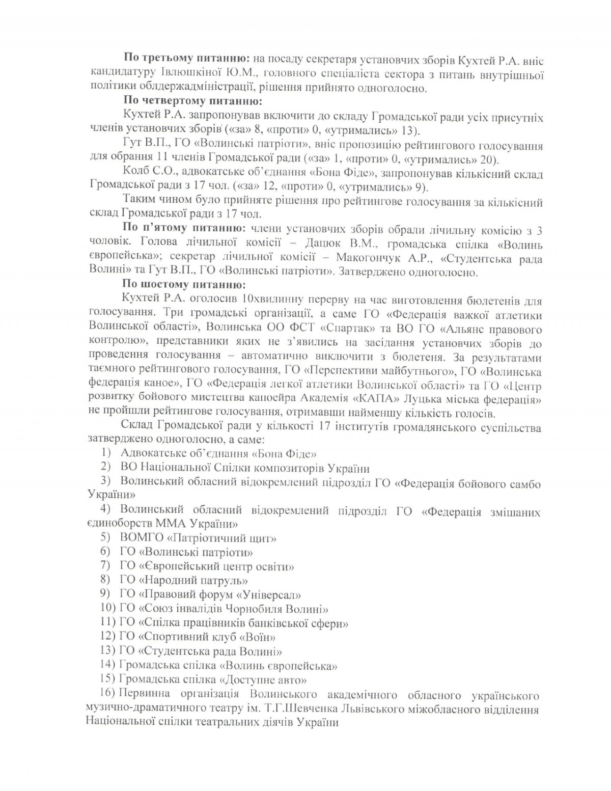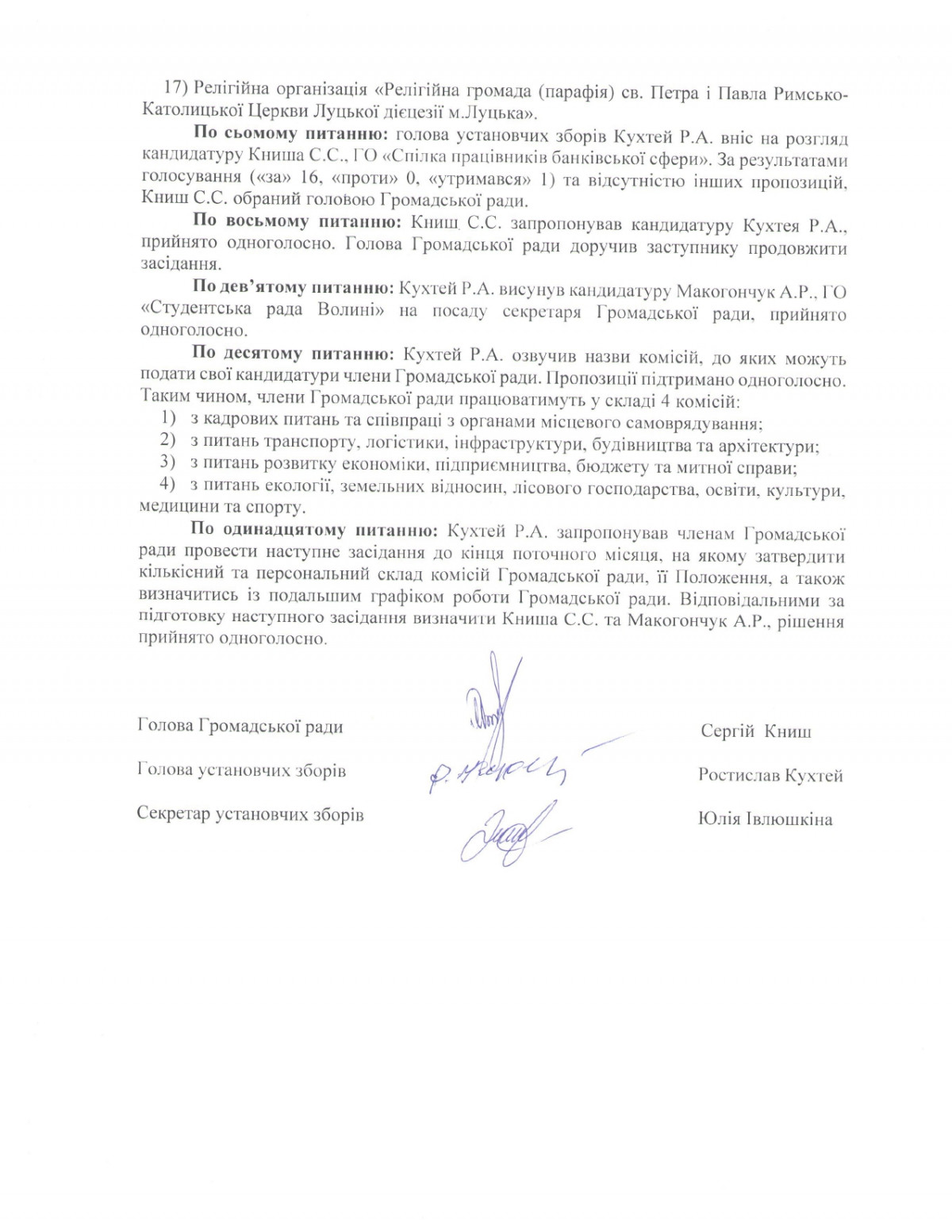 По п’ятому питанню: члени установчих зборів обрали лічильну комісію з 3 чоловік. Голова лічильної комісії – Дацюк В.М., громадська спілка «Волинь європейська»; секретар лічильної комісії – Макогончук А.Р., «Студентська рада Волині» та Гут В.П., ГО «Волинські патріоти». Затверджено одноголосно.