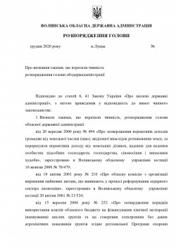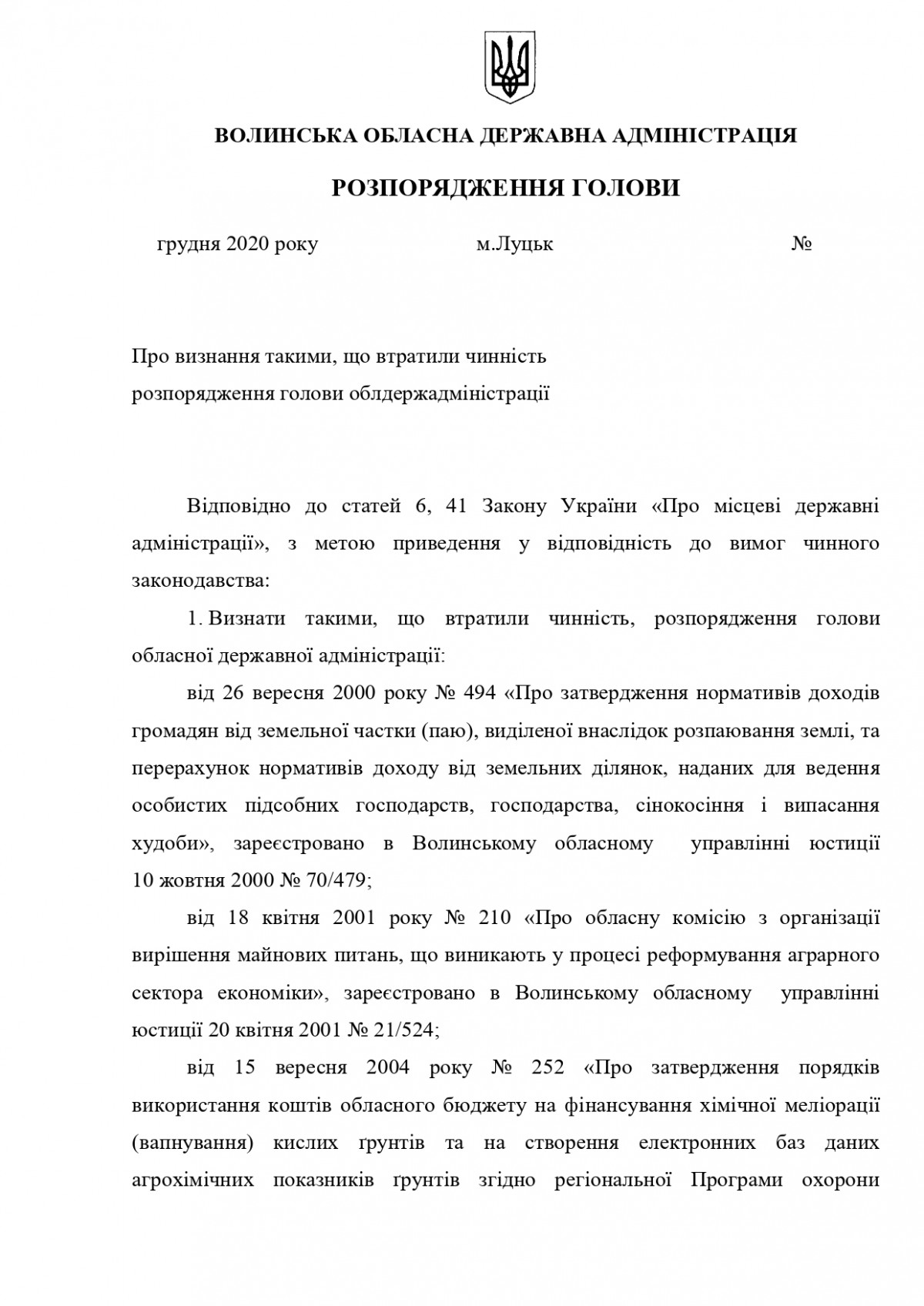 24 грудня 2020, 09:44 останні оновлення: 10 лютого 2022 Про визнання такими, що втратили чинність розпорядження голови облдержадміністрації